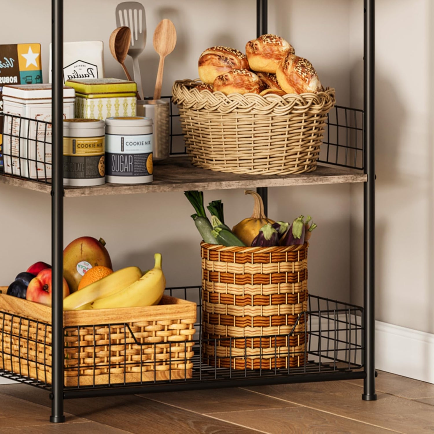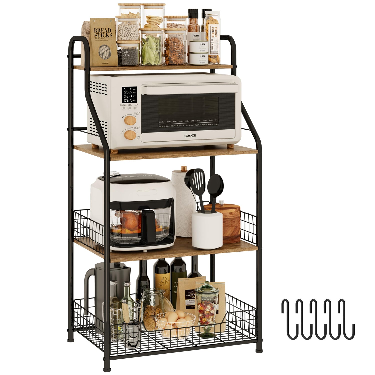 - 【Versatile Metal Wire Barrier And 5 S-Shaped Hooks】 The kitchen storage includes a metal wire barrier and five S-shaped hooks. The barrier can be installed on either of the bottom two tiers to prevent items from falling, or left off for an open look. The S-shaped hooks are ideal for hanging pots, pans, utensils, and more, keeping your kitchen tools organized and accessible.