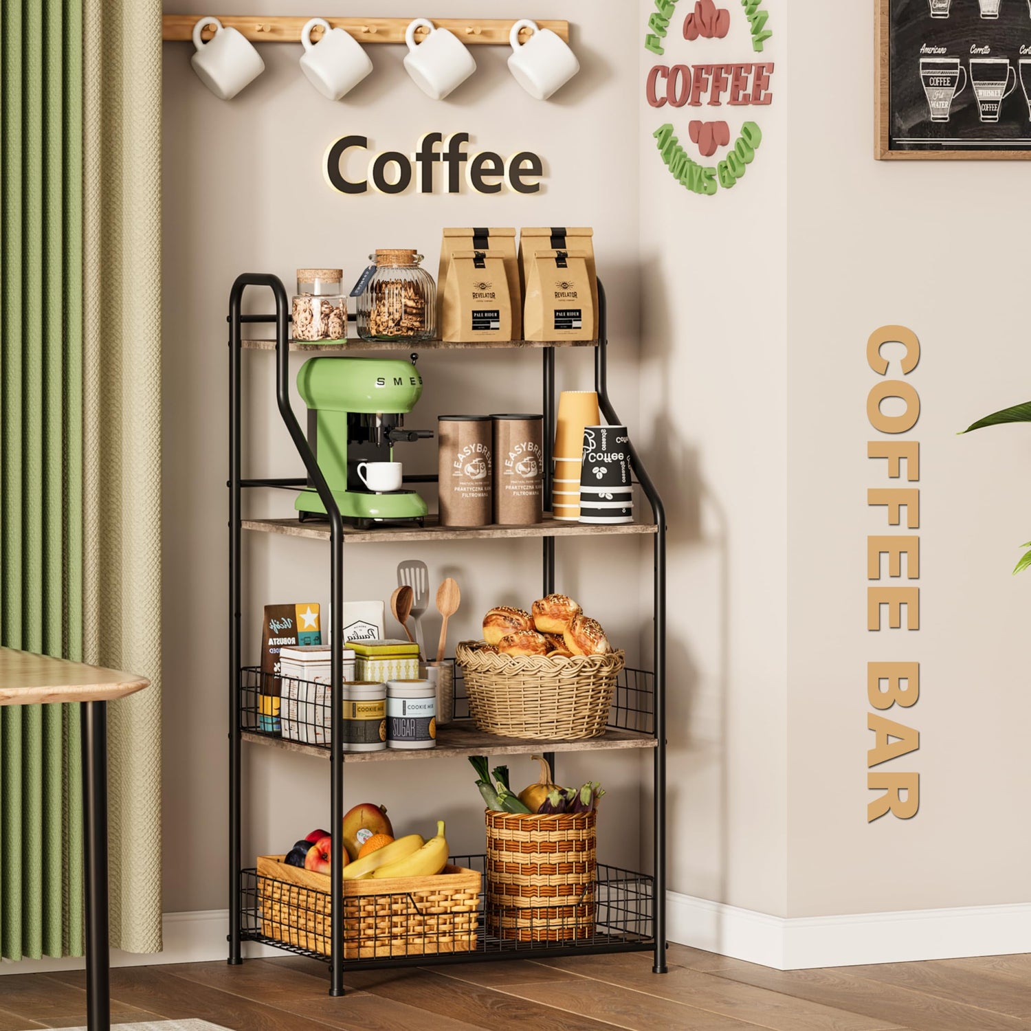 - 【Adjustable Foot Pads For Stability On Any Surface】 Our coffee cart cabinet features four adjustable foot pads, ensuring stability on any floor type. Adjust the foot pads to keep the rack stable and no oscillation, even on uneven surfaces. This feature provides peace of mind, knowing that your coffee station and its contents are secure, eliminating the frustration of unstable shelving units.