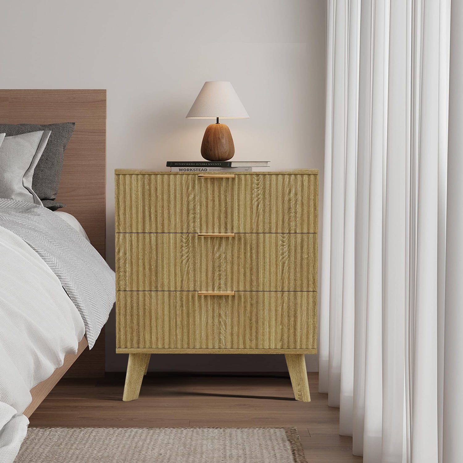 Mid-Century 3 Drawers Bedside Table Cabinet, Modern Nightstand with 3 Drawer and Solid Wood Legs, Contemporary 3-Drawer Nightstand, Mid Century Nightstand with 3 Storage Drawer for Bedroom (Natural)