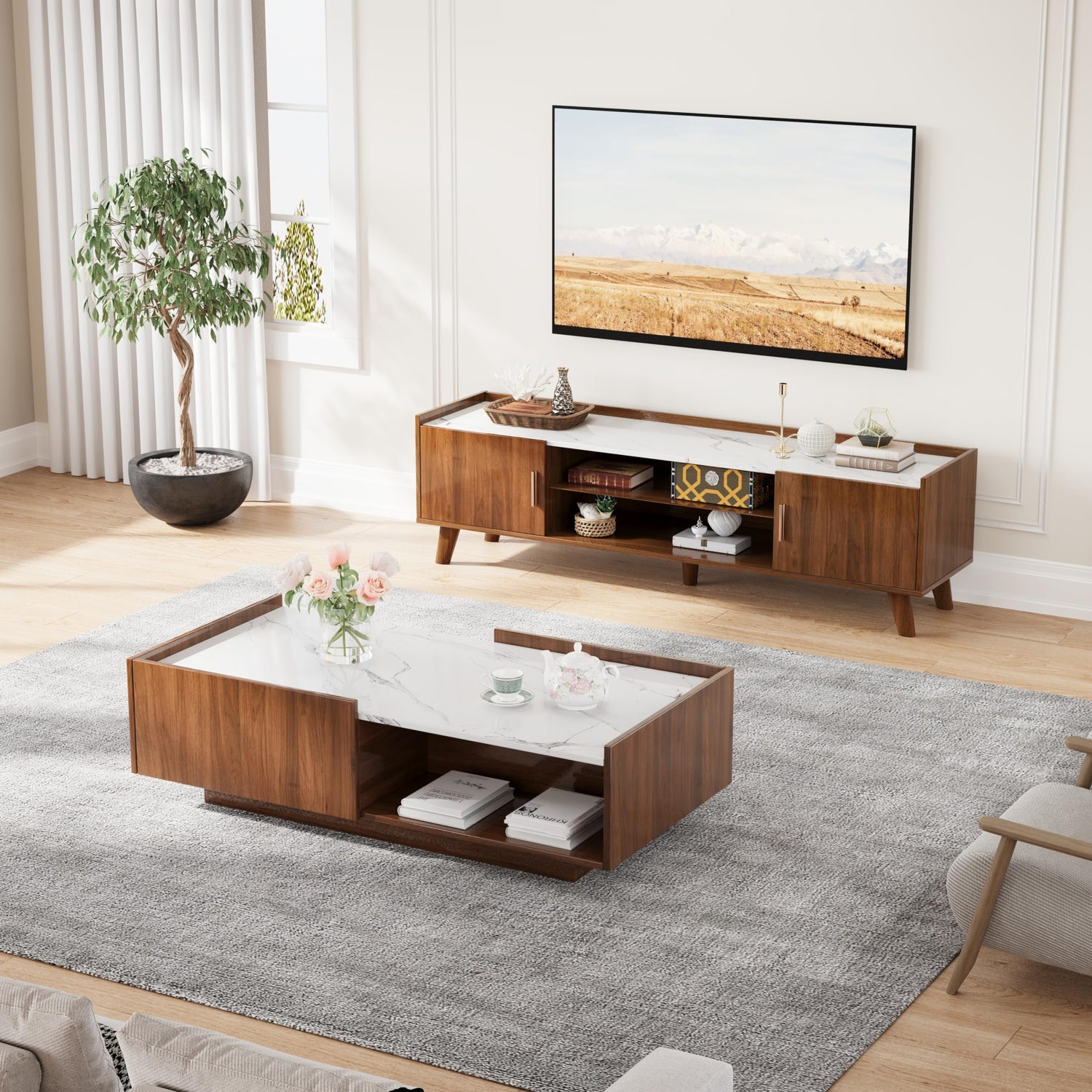 Mid Century Modern Coffee Table, 47.2" LED Rectangle Accent Center Table with 2 Sliding Drawers and Open Display Shelf for Living Room, (Walnut Grain and High Glossy White Marble Color Top Plate)