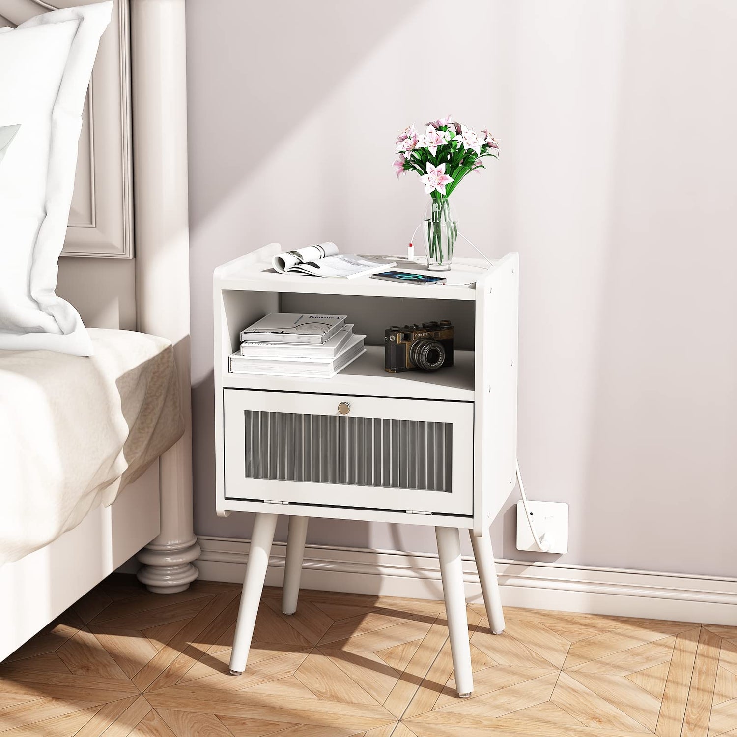 Mid Century Modern Nightstand with Charging Station, Bedside Tables with Glass Decorative Door, End Table Side Table with 2 Tiers Storage Space, for Bedroom, Living Room, White