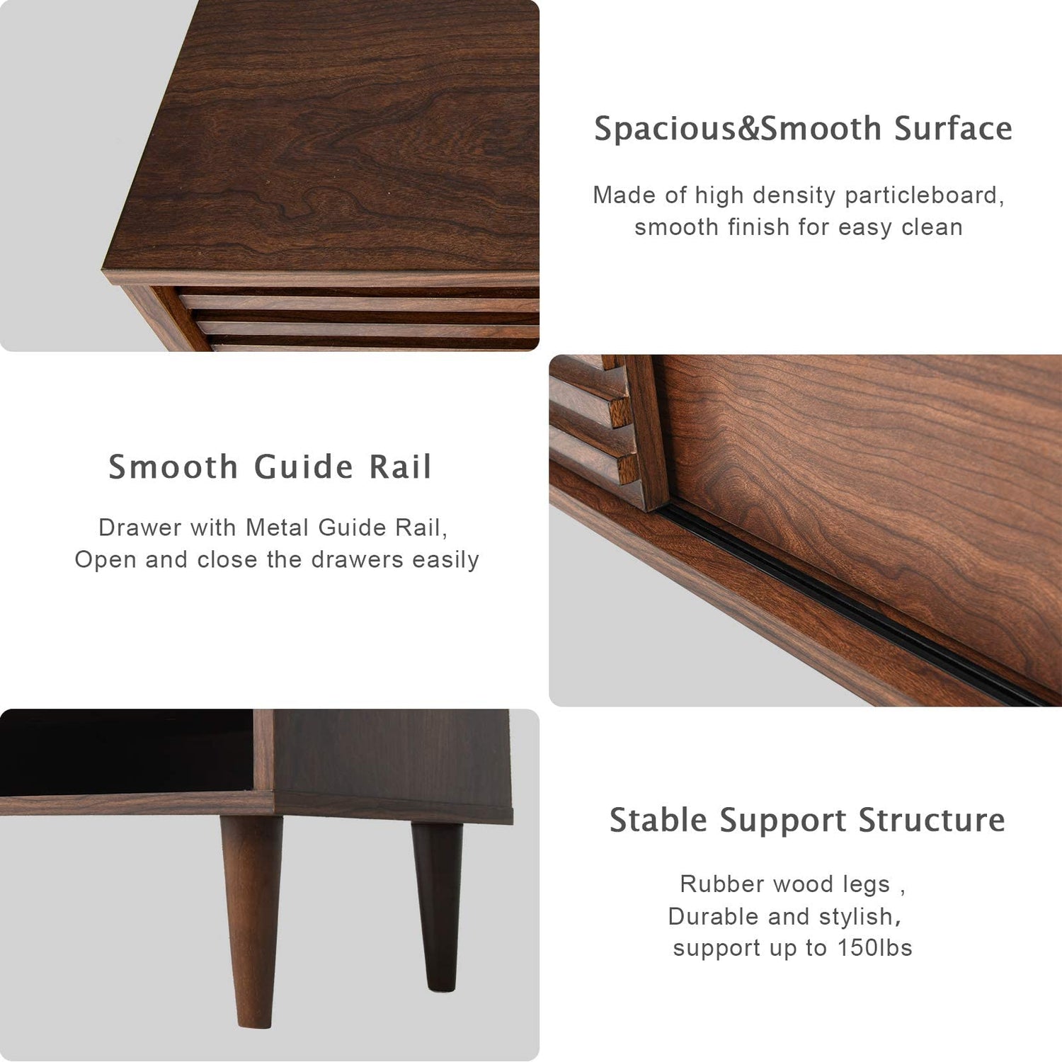 - 【Ample Storage & Practical】 Mid-century tv stand features 2 storage cabinets with 3-level adjustable shelves are suitable for storing different sizes of items. 2 sliding doors allow you to customize to show or hide any storage spaces. The center open shelf is good for placing electronic items such as CDs, gaming stuffs. The drawer can be used to place small object. Cable management design allows you to organize the mess wires easily.