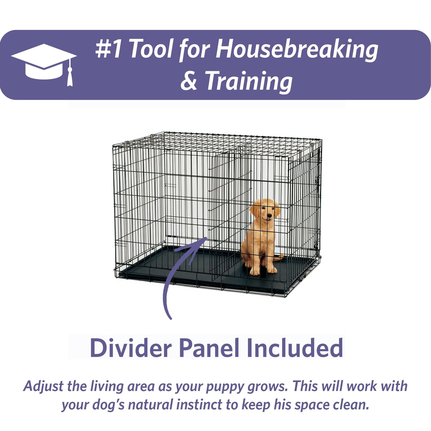 Details: The iCrate folding metal dog crate by MidWest Homes for Pets includes all of the features you will need to provide a convenient, safe & secure pet home for your best friend, from puppy to adulthood. This crate includes a divider panel allowing you to adjust the size of the living area as your puppy grows. The plastic leak-proof pan allows easy clean-up in the event of an accident. A strong plastic carrying handle is included for convenient portability, and rubber feet on the bottom of the crate protect the floors inside your home. We recently enhanced the safety and security of the iCrate by adding locking tips on the slide-bolt latches to securely lock the door and patented Paw Block, which prohibits your dog from tampering with the door lock from the inside. MidWest iCrate crates also feature patented rounded side clips that reduce possible sharp points to ensure a safe experience for you and your pet. Every iCrate metal dog crate conveniently folds down flat for travel. The 42" iCrate (model 1542U) measures 42L x 28W x 31H inches and is suitable for "large" dog breeds. **Please note the term "large” breed is subjective. For the best fit, we advise that you check the measurements of the dog crate and select a size that will be suitable for your dog's ADULT weight and measurements. Your dog should be able to comfortably sit upright, lay down, and easily turn around inside the crate. When in doubt, we suggest you purchase a larger crate option. We at MidWest Homes for Pets understand that your dog is a part of your family; that's why we ensure our dog crates are manufactured with the highest quality control standards to create a safe and secure home for your pet. Assembly and safety instructions are included; please read all safety instructions prior to use.