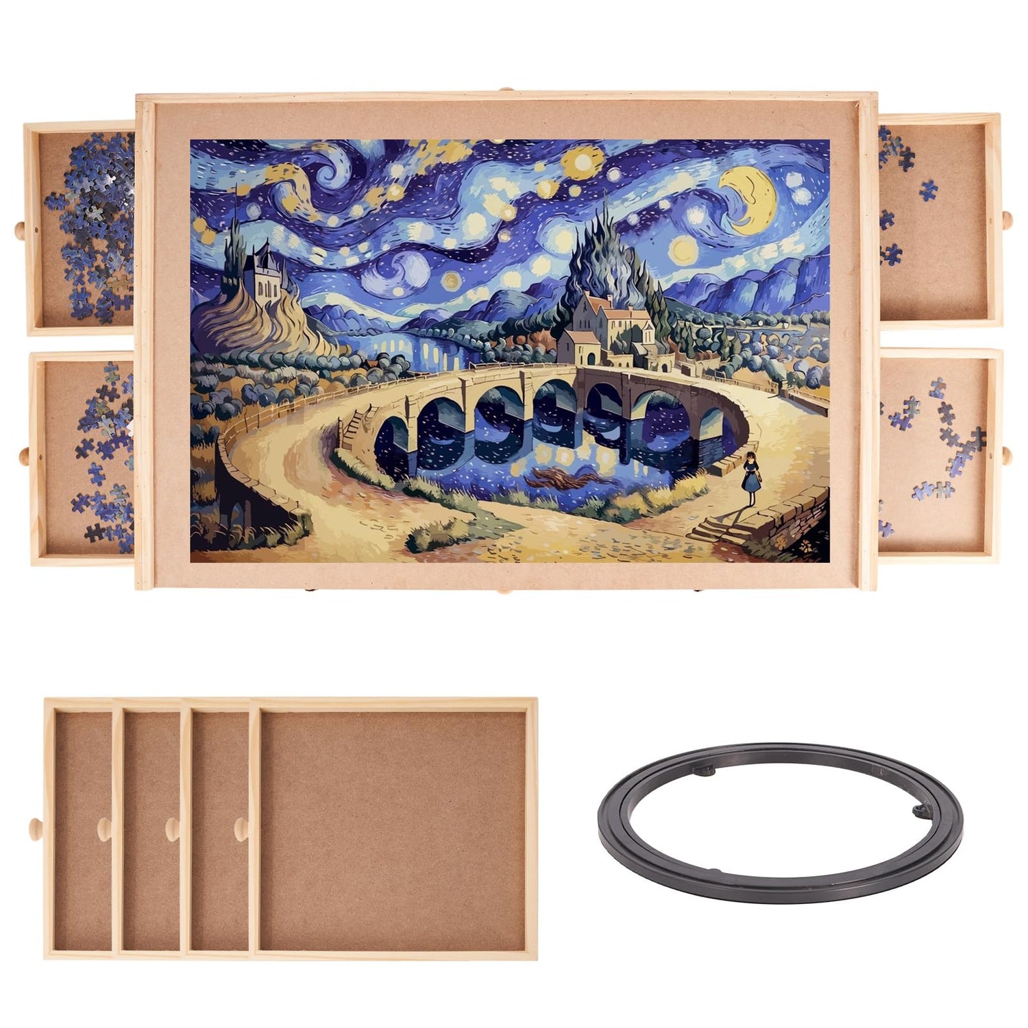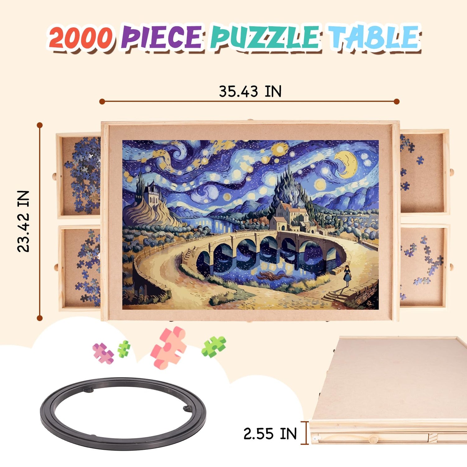- Rotating Puzzle Board: The jigsaw puzzle table measures 35.43 x 23.43 inches and can hold up to 1500-2000 pieces. The rotating puzzle table includes 1 Extra Large Clear Puzzle Saver Peel, 1 bottom swivel ring, 6 puzzle drawers. Wooden puzzle table is perfect for puzzle lovers of all ages.