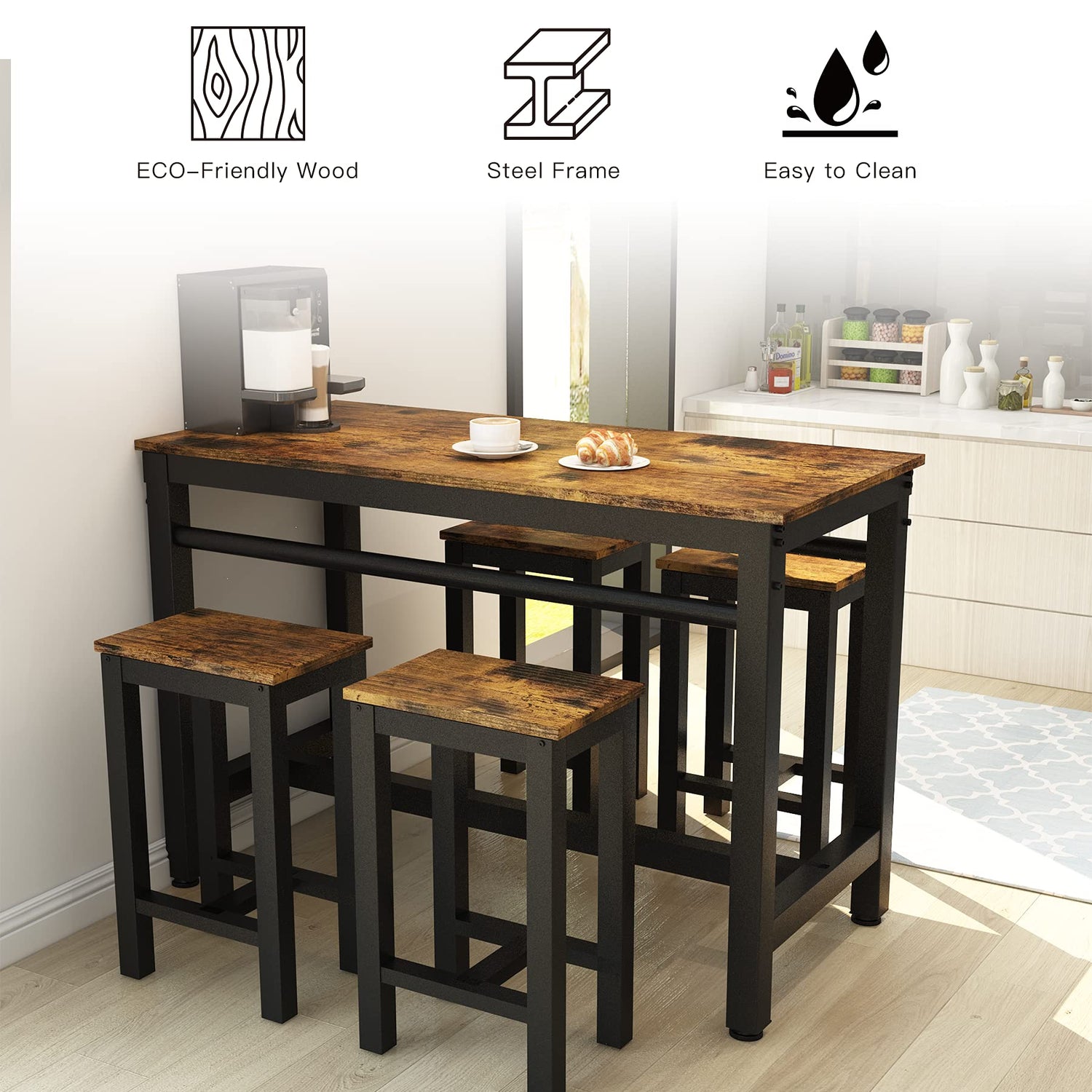 MIERES 5-Piece Rustic Brown Dining Table Set for 4 with Sturdy Metal Frame