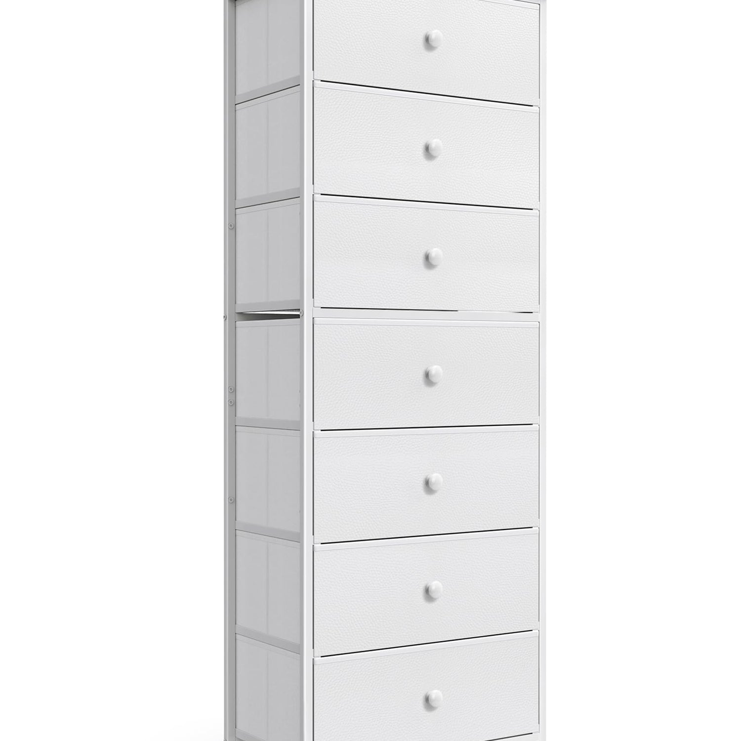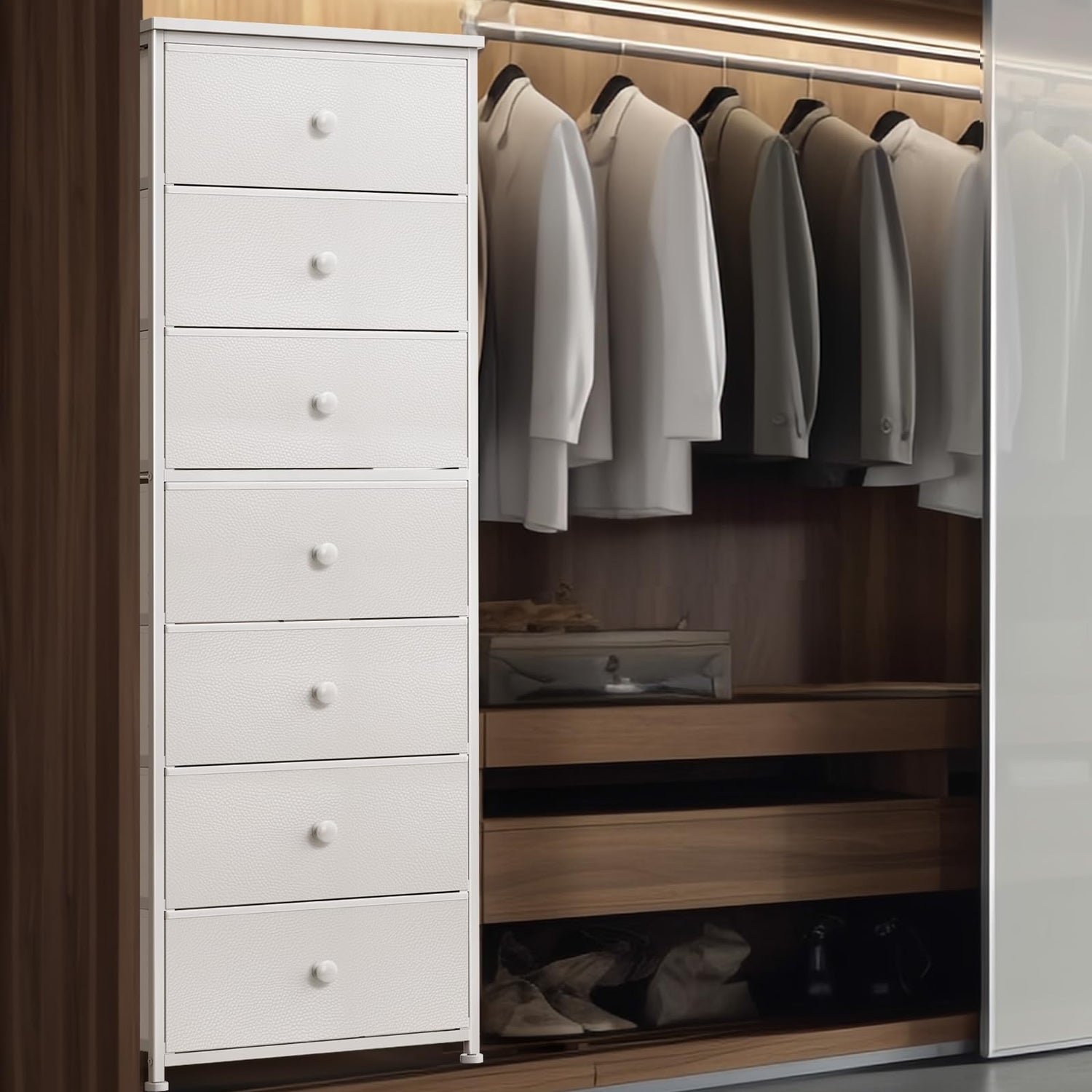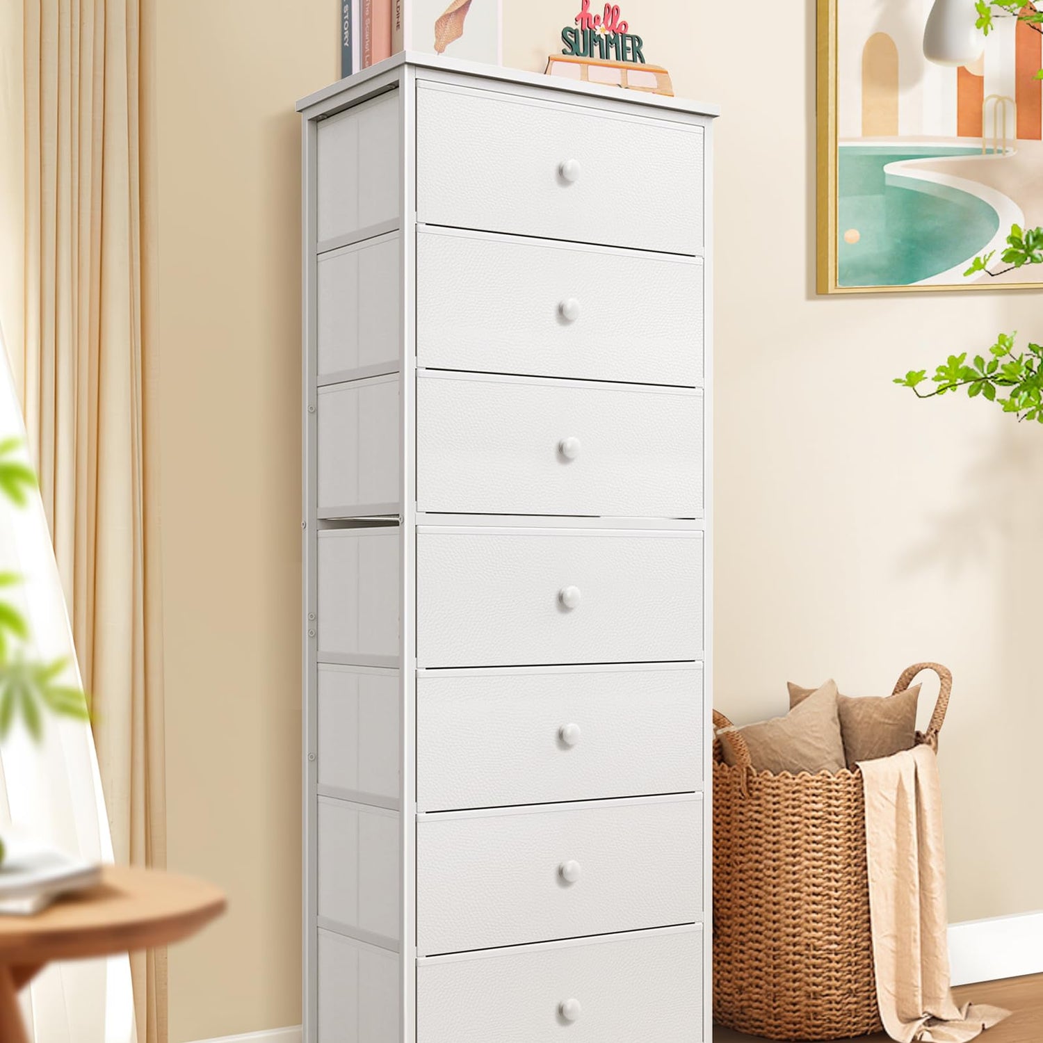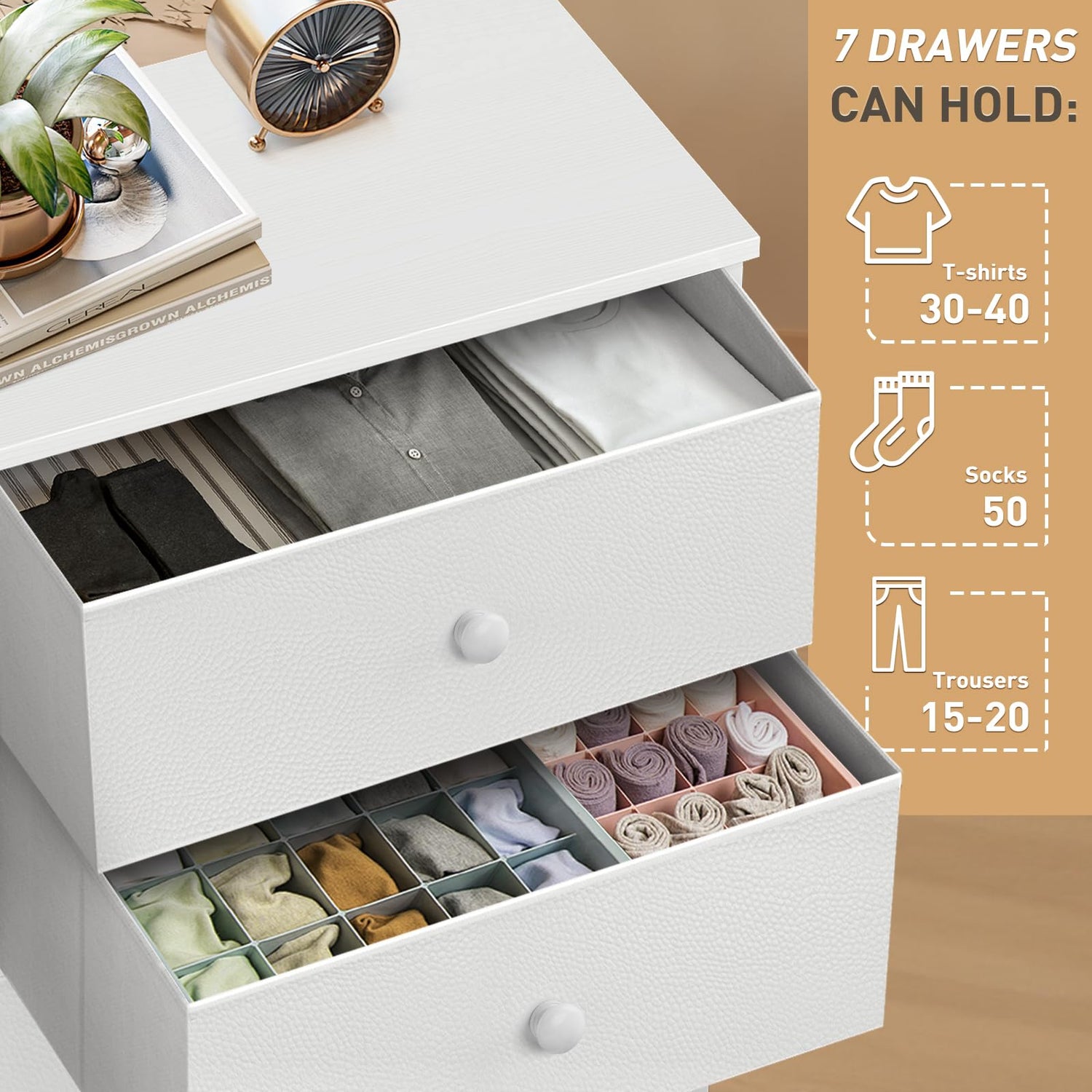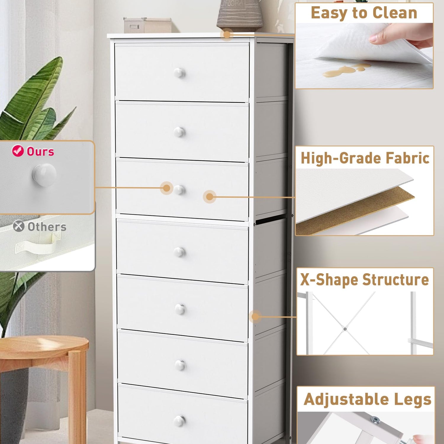 Mifuro Tall Fabric Dresser for Bedroom, Vertical Storage Organizer Tower with 7 Drawers, Chest of Drawers with Fabric Bins, Steel Frame, Wood Top for Bedroom, Closet, Entryway- White