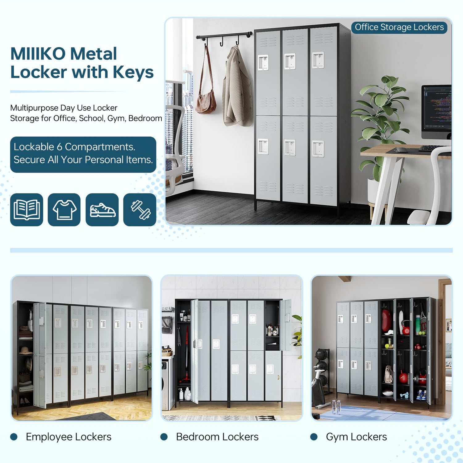 MIIIKO 2 Tier Metal Lockers 3-Wide, 72" x 36" x 16" Storage Locker Units with 6 Compartments, Large Employee Locker with Shelves, Lockable Doors and