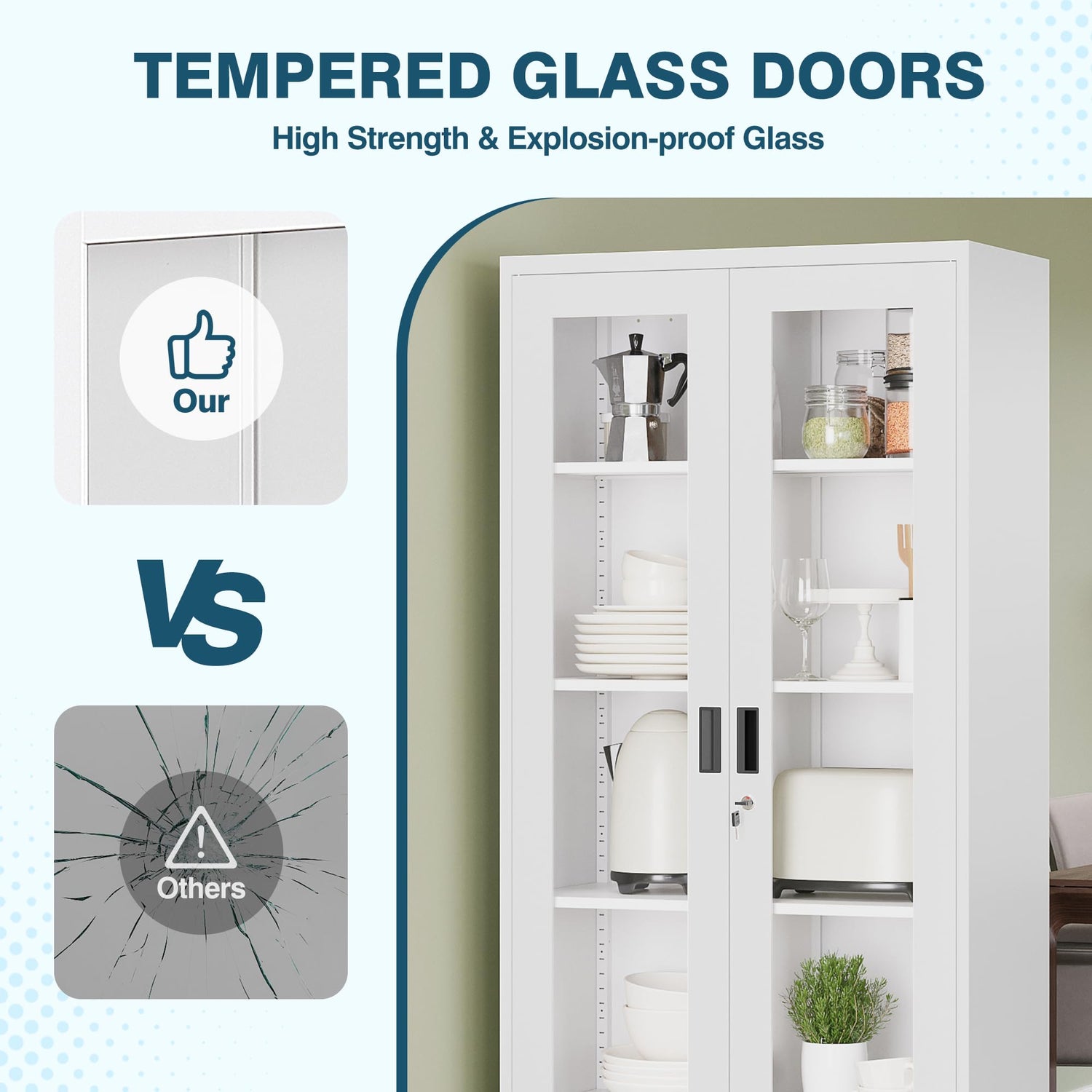 MIIIKO Display Cabinet with Glass Doors, Home Office Cabinet for Collectibles, 71" Tall Locking Metal Storage Cabinet with 4 Adjustable Shelf, Bookcase Display Case White…