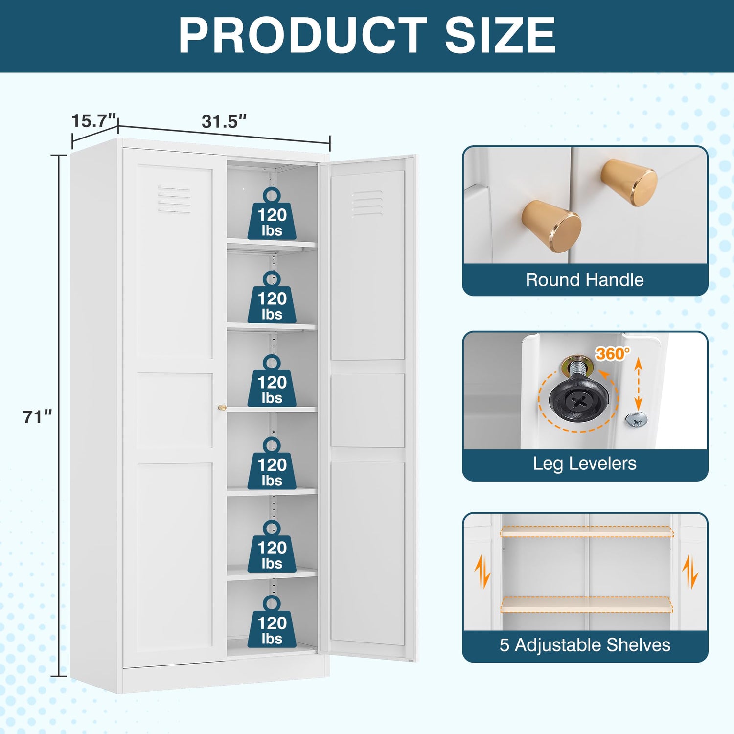 - 【Spacious Storage Cabinet】Tall storage cabinet size is 71'' H × 31.5'' W × 15.7'' D. This white cabinet provide high storage capacity with 5 adjustable shelves, which is perfect for storing your clothes, kitchenware, food, or other household items.