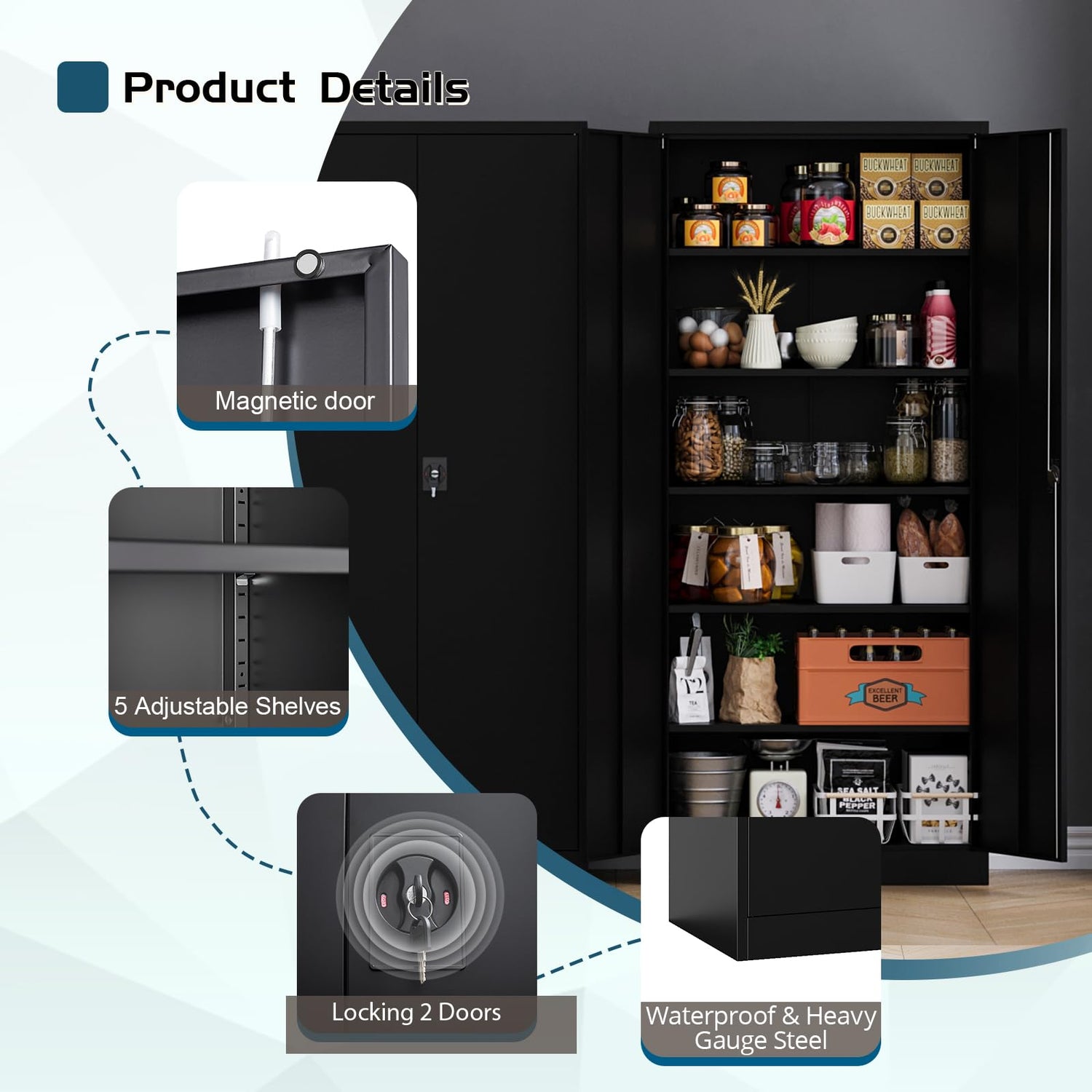 - 【COMPACT STORAGE】Behind two locking doors, there is 5 adjustable shelves, which provide ample space for garage, kitchen, home and office supplies and other valuable items. It will suit any commercial office decor or home garage storage.
