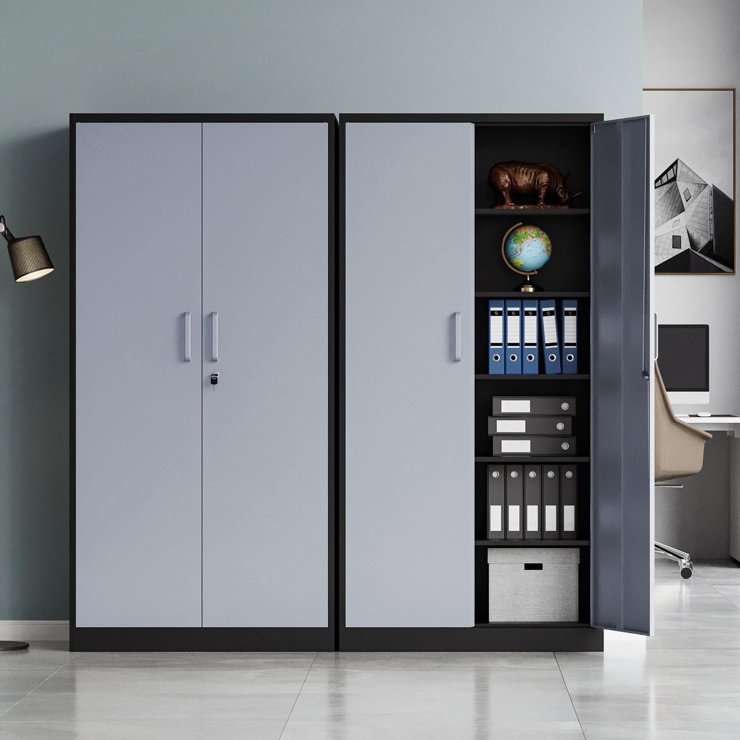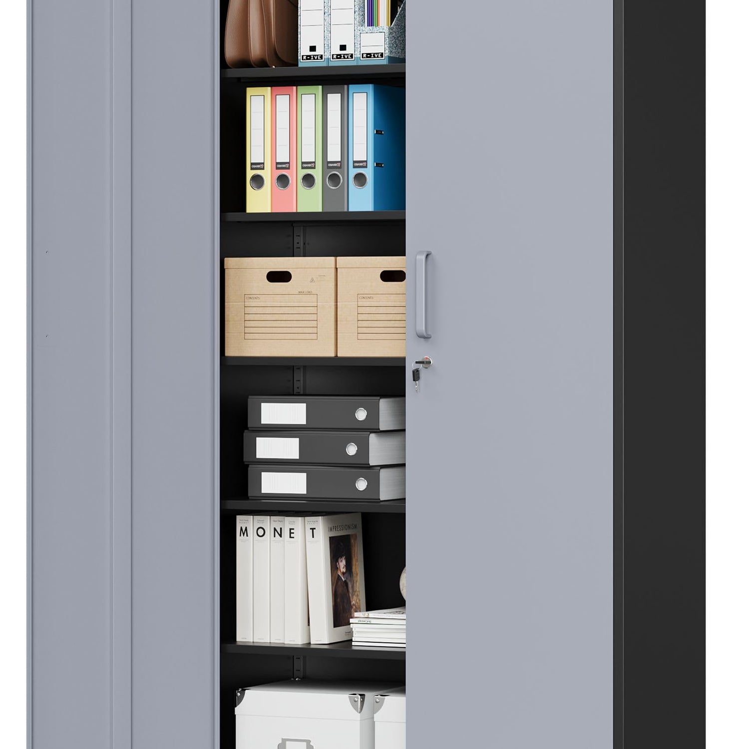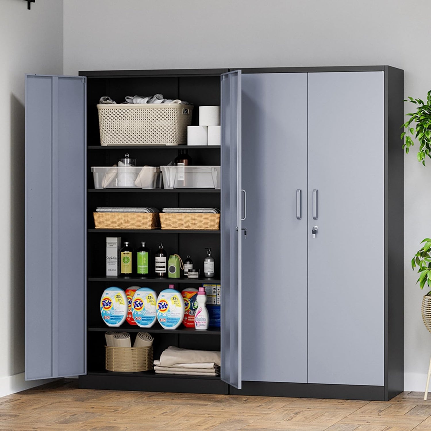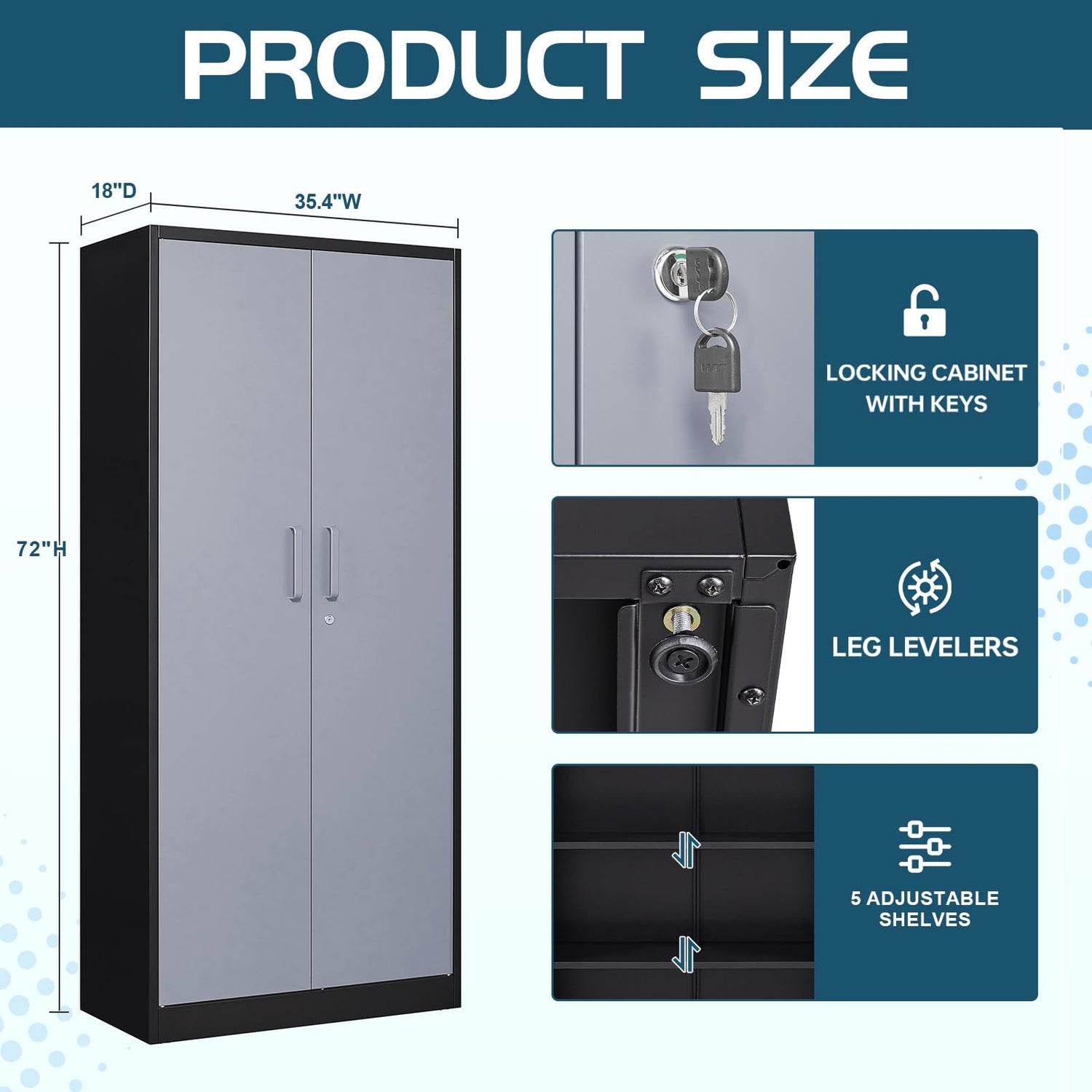 - 【SUFFICIENT SPACE】Tall storage cabinet size is 72'' H × 36'' W × 18'' D. This heavy duty steel cabinet provide high storage capacity with 5 adjustable shelves, which is perfect for storing wide variety of supplies for your kitchen, office, garage, and more.