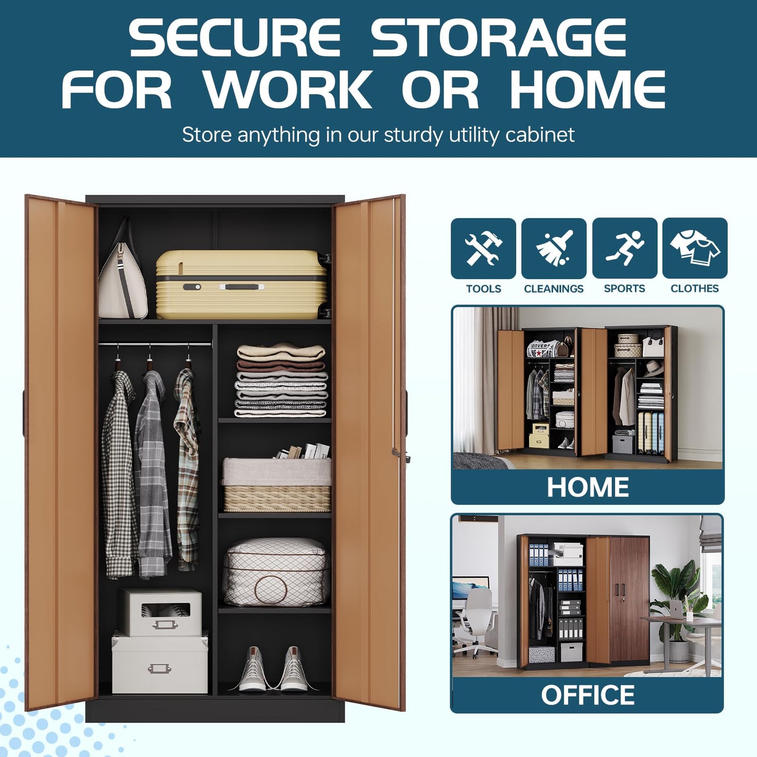 MIIIKO Metal Wardrobe Cabinet with Locking Doors, Metal Storage Armoire Closet for Clothing, 2 Door Woodgrain Locker Cabinet with Adjustable Shelves for Bedroom, Locker Room, Home Office and Garage…