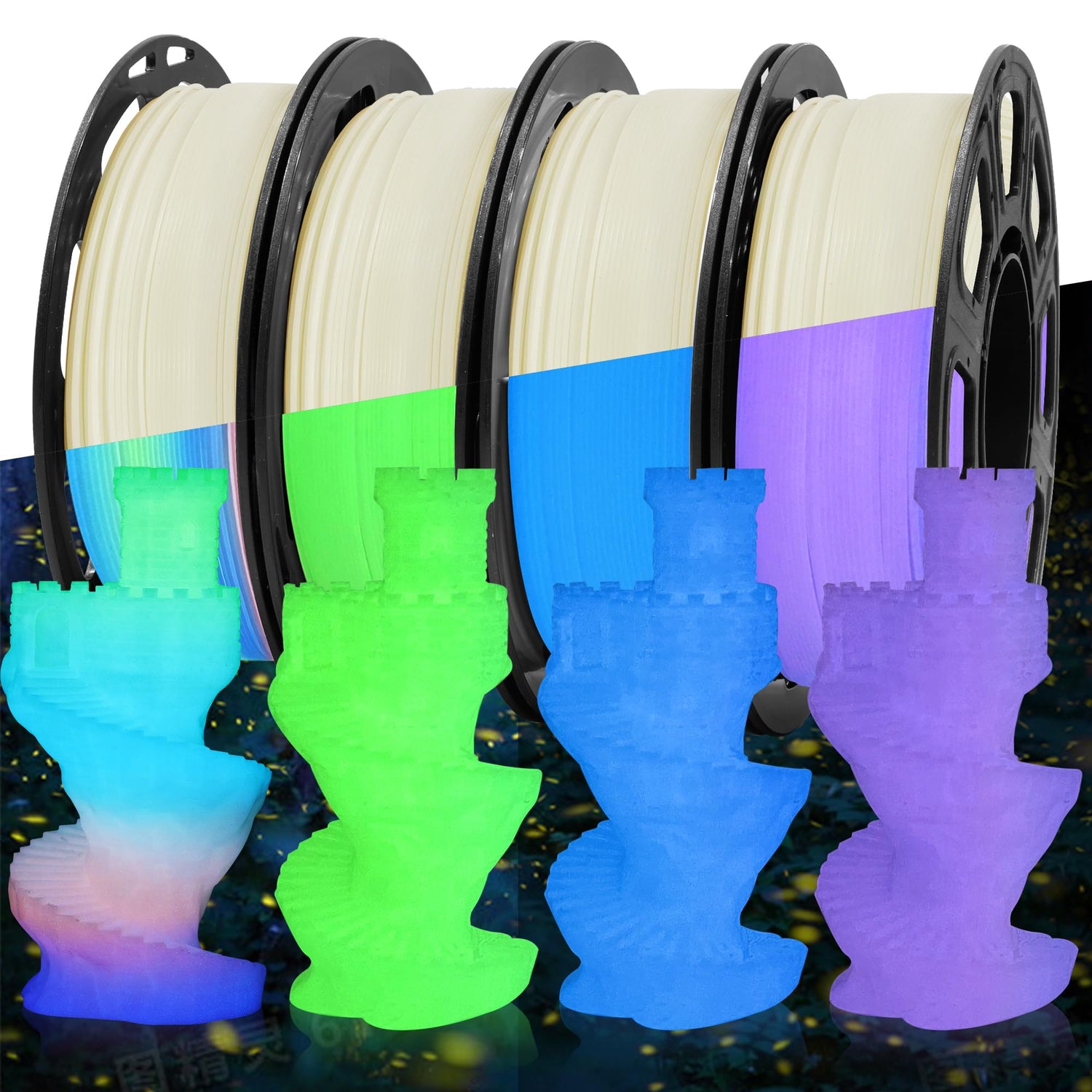 - 4 Spools of Glowing in Dark PLA Filament Bundle: One Spool Glow in Dark Green, One Spool Glow in Dark Blue, One Spool Glow in Dark Purple, One Spool Glow in Dark Fast Color Change Rainbow; The Glow in Dark Green Color with Most Fluorescent Effect Compare Other Colors Glowing in Dark. Total 4 Different Glowing in Dark PLA Packed in One Box; Each Spool Net Weight is 250g, 4 Spools Packed, Total 1kg 3D Material Packed in One Box