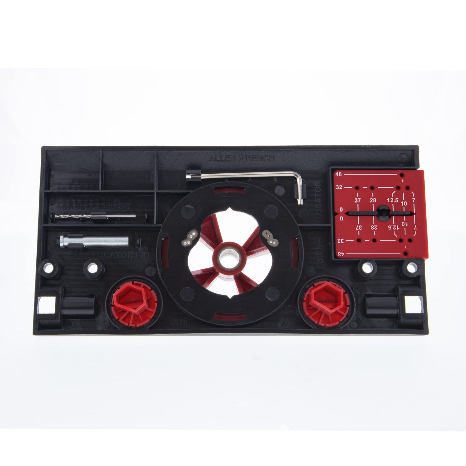 - Two edge alignment knobs position the cup hole from the edge of the door, while the edge pin sets the distance from the top/bottom.