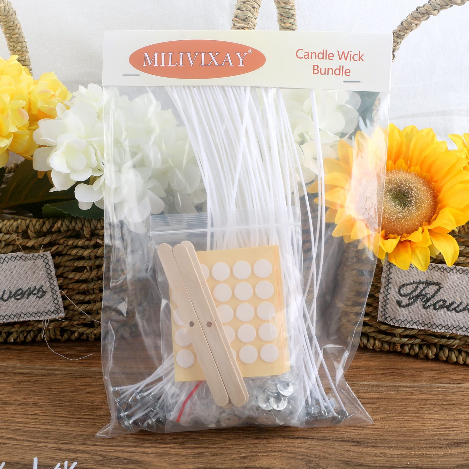 MILIVIXAY 100PCS 10 inch Candle Wicks with 100 Metal Tabs, 100PCS Candle Wick Stickers and 6PCS Wooden Candle Wick Holders - Wicks Coated with Paraffin Wax, Cotton Wicks Kits for Candle Making.