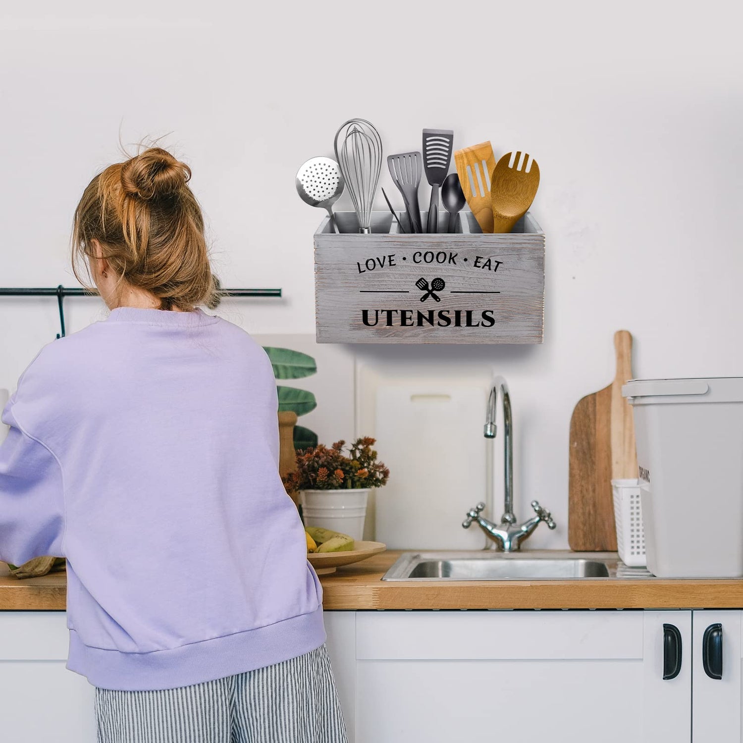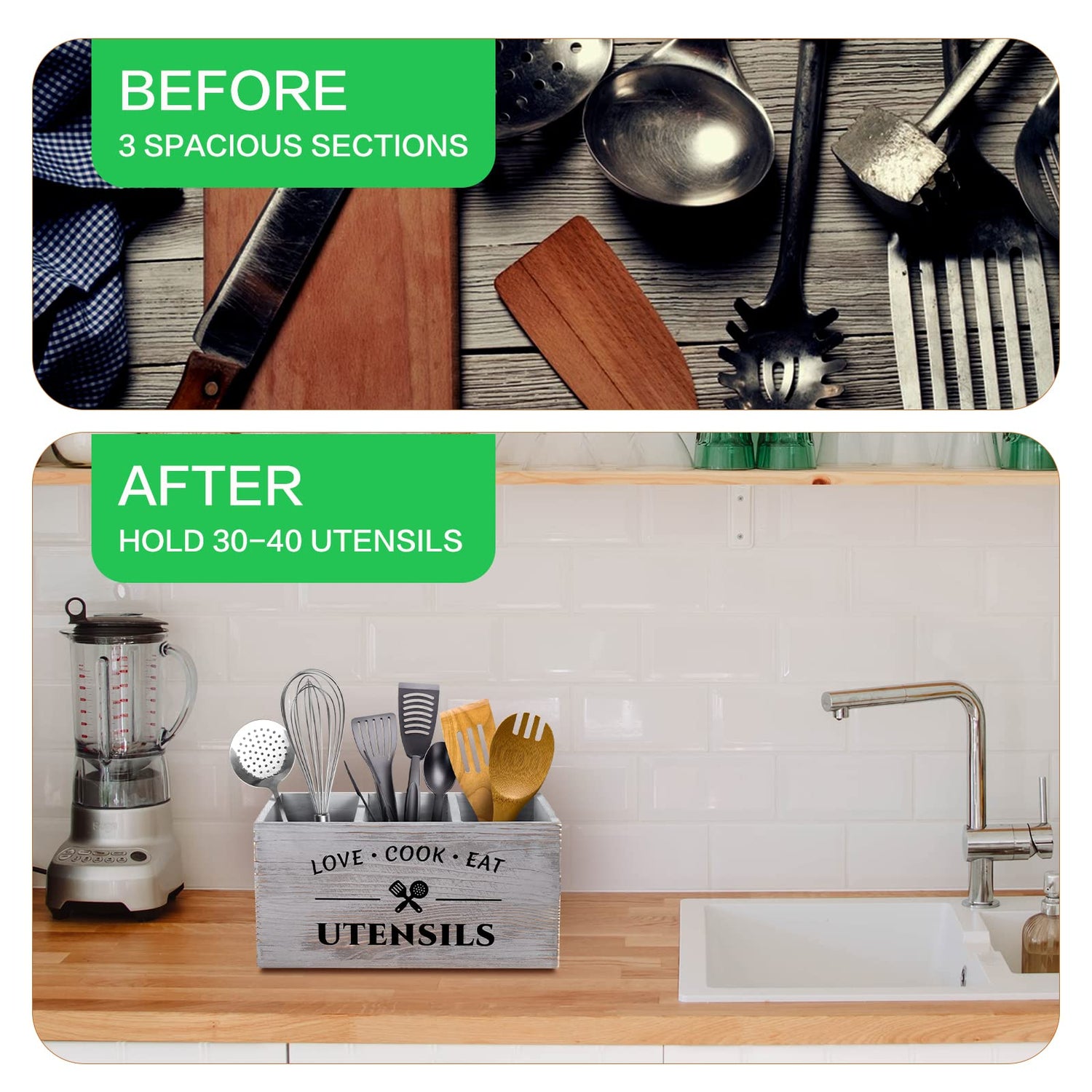 - 【Kitchen Essential Storage Organizer Box】Our farmhouse Utensil Storage Holder made of 100% premium solid pine wood is more sturdy and durable, 3 compartments designed easy to store various cookware, knives, spatulas, tongs, egg beaters, ladle, Skimmers, peelers, corkscrews, silverware, forks, chopsticks and more, keep your kitchen utensils neatly in place. ***Note: The package is not include any tableware!!!