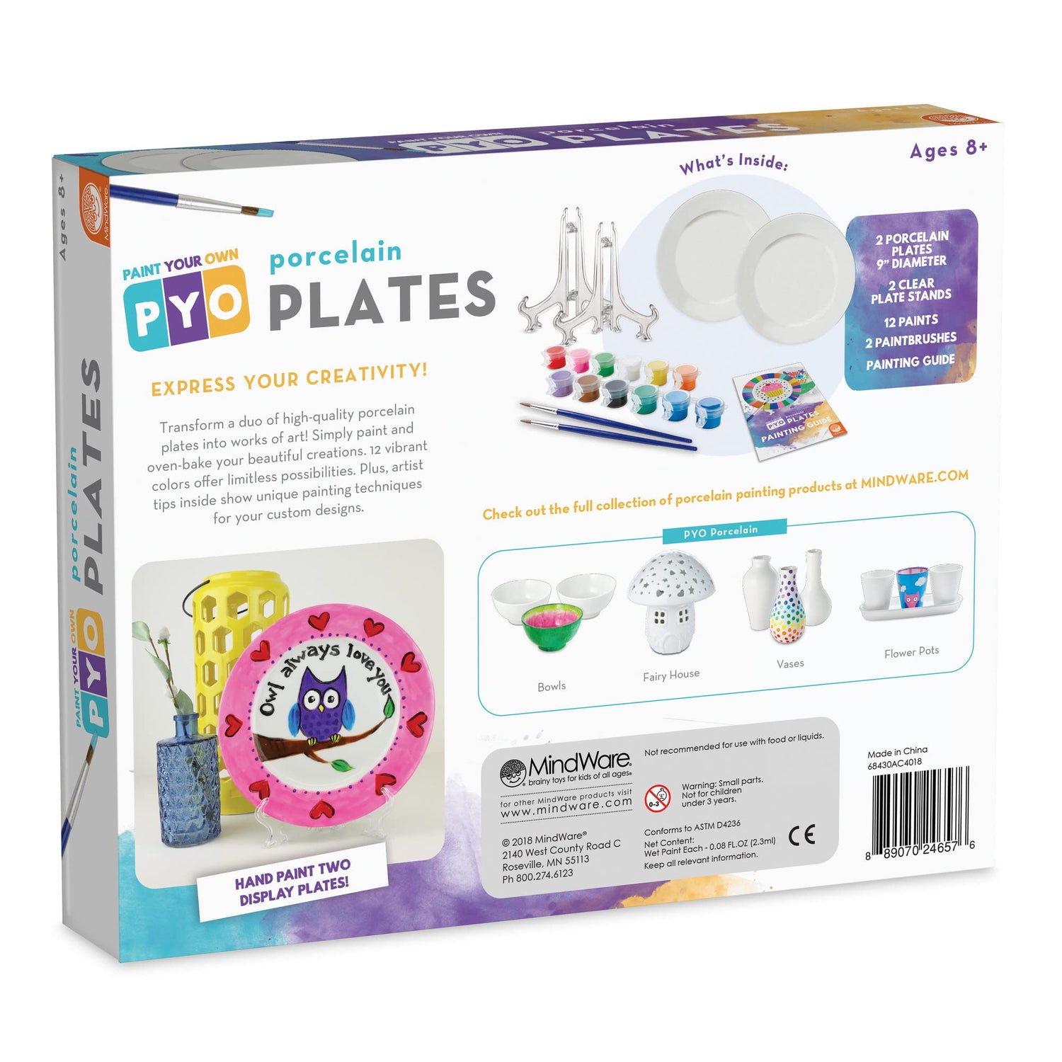 - Includes: 2 porcelain plates, 12 paints, 2 paint brushes, and 2 clear plate stands. (Ages 8 and up)