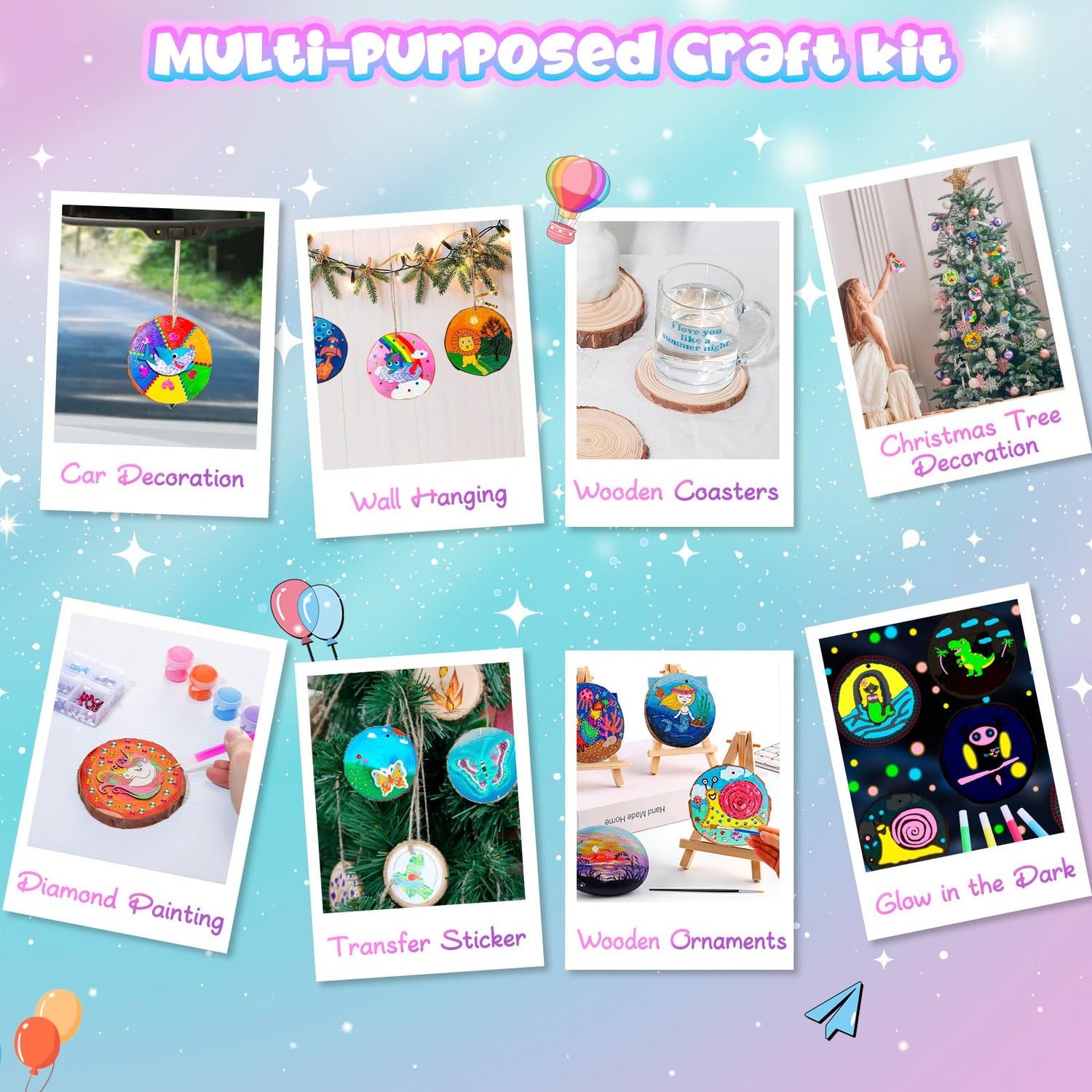 - Comprehensive craft set: 26 wood slices, 10 wooden ornaments, 4 felt sheets, 40 wiggle eyes, 4 glow-in-the-dark paints, 4 glitter glues, 4 transfer stickers, 2 diamond pens, 5 clays, 2 diamond plastic trays, 25ML glue, 1 color palette, 2 brushes, jute twine (33 FT), 12 kinds of acrylic paints, and 2000 acrylic diamonds. Ideal for wood chip painting, this set offers endless possibilities to spark your child's imagination and creativity.
