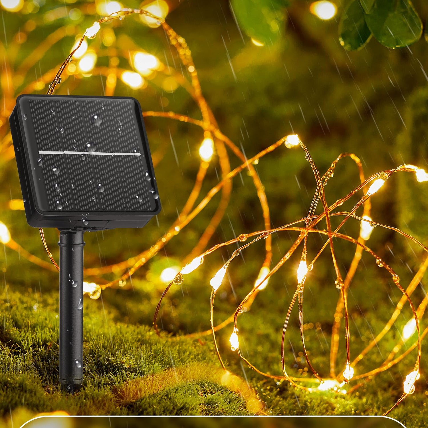 - 【IP65 Waterproof】Our outdoor solar string lights are suitable for both indoor and outdoor use. With an IP65 waterproof rating, they can withstand all weather conditions. These solar Christmas lights work even in light rain or splashing water, making them ideal for outdoor decoration.
