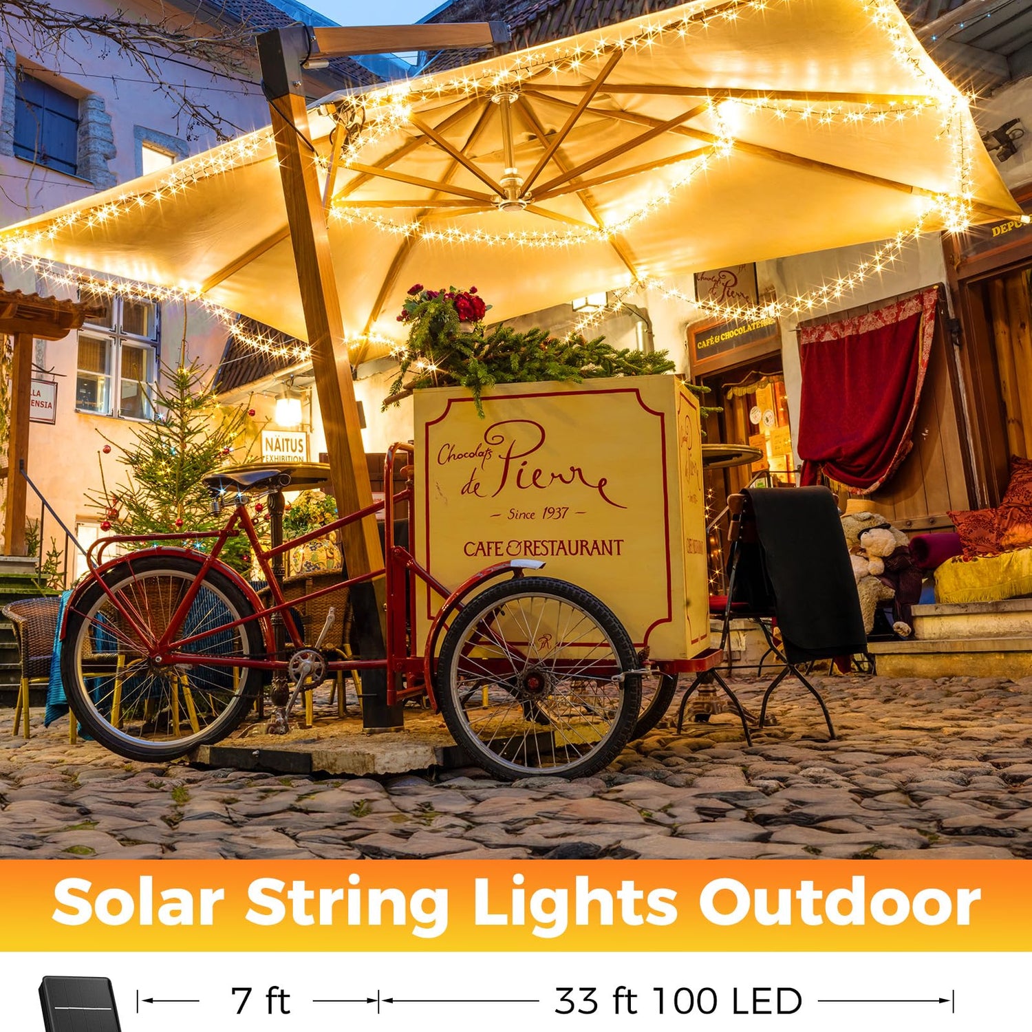 - Solar Christmas Lights Outdoor Decoration: Our christmas string lights solar powered has 33ft lighting length, 7ft lead wire, total 40ft length, which can be easily installed in the place where decoration is needed. It can be used to gardens, courtyards, trees, porches, roofs, fences bistros, restaurants, hotels, commercial buildings, also can also be used in weddings, parties, Christmas, New Year parties to create a warm, joyful and festive ambiance