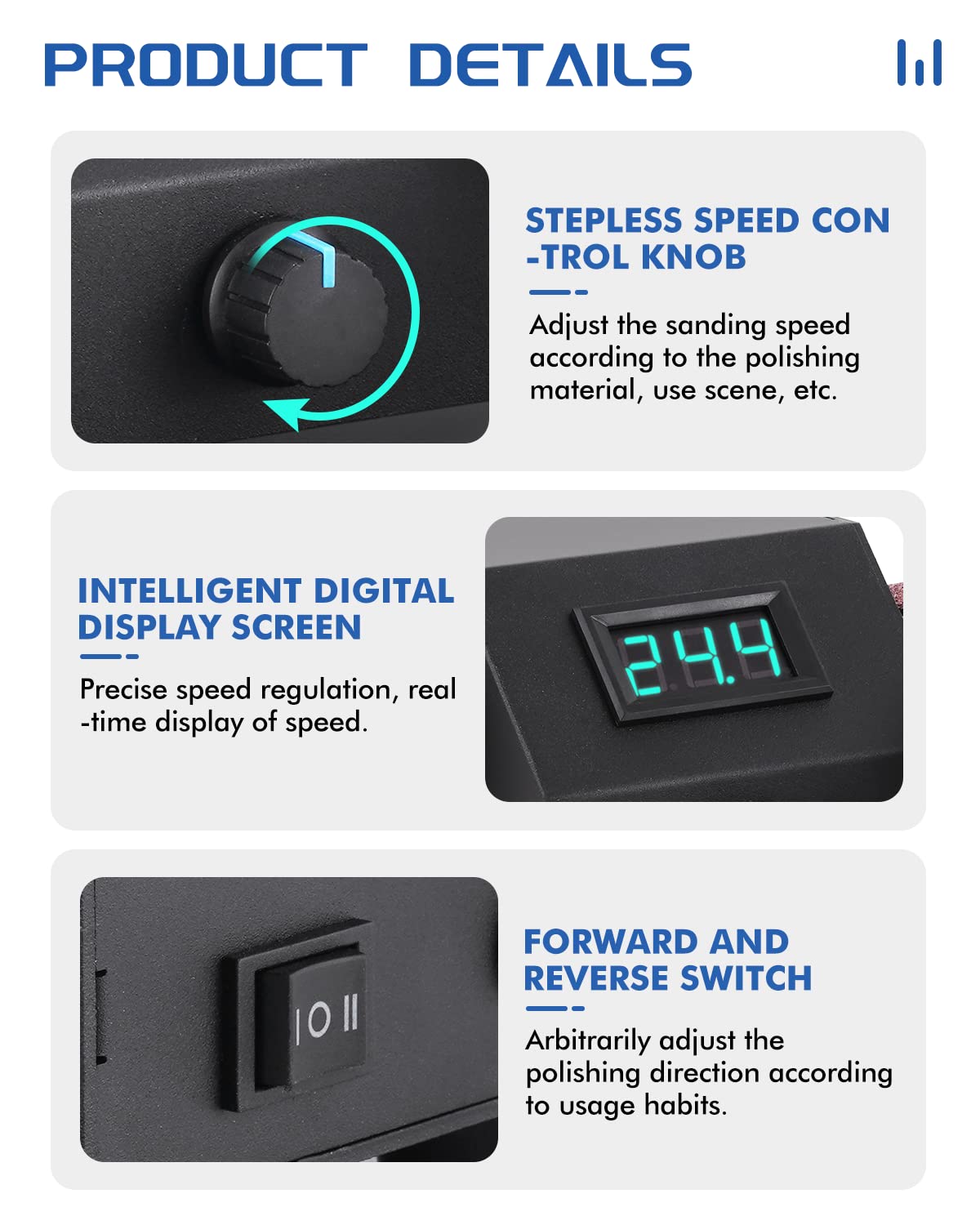 - 3.【UPGRADE DESIGN】-- The knife belt sander machine with digital display and stepless speed regulation, it shows the speed change, very intuitive, convenient to know the speed required by different products, easy to adjust the speed when using again.