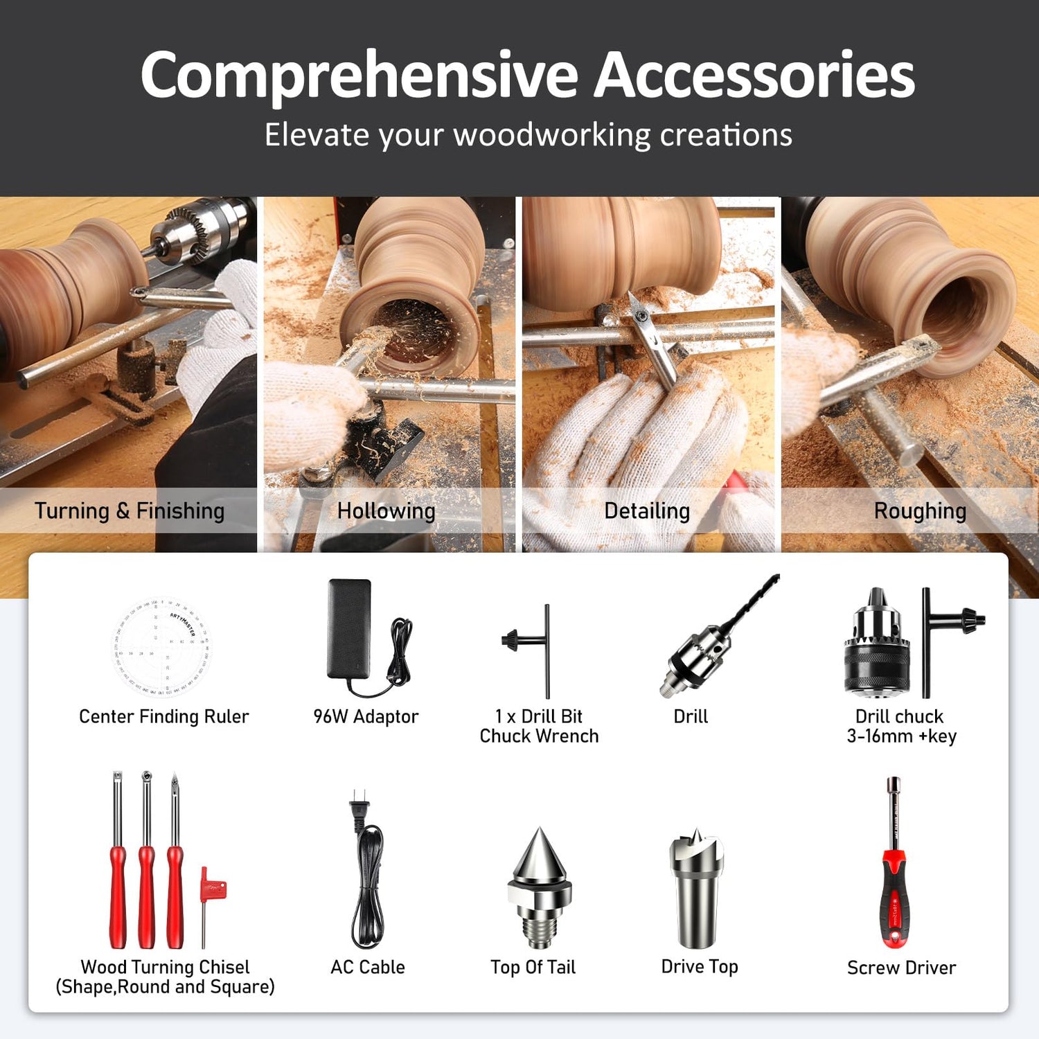 - Full Set of Accessories: This benchtop lathe comes with a set of versatile tool accessories, including professional turning tool combo(round, square, and diamond-shaped tools) with changeable cutter heads, a Drill chuck set (with a clamping range of 0.12-0.63 inches), a drive center, a live center, a centering ruler, and 3 adjustment wrenches, catering to a wide range of applications such as turning, cutting, drilling, rounding, grinding, and polishing.