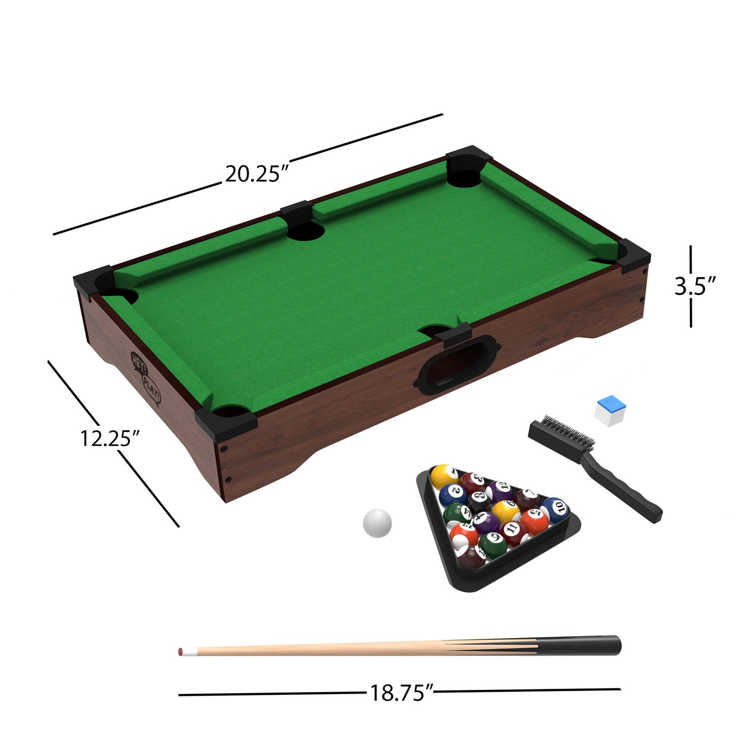 - PRODUCT DETAILS - Materials: Wood. Dimensions: (L) 20.25" x (W) 12.25" x (H) 3.5"; Cue Sticks: (L) 18.75"; Pool Balls: (L) 1". For Ages 14 and up. Color: Woodgrain/Green.