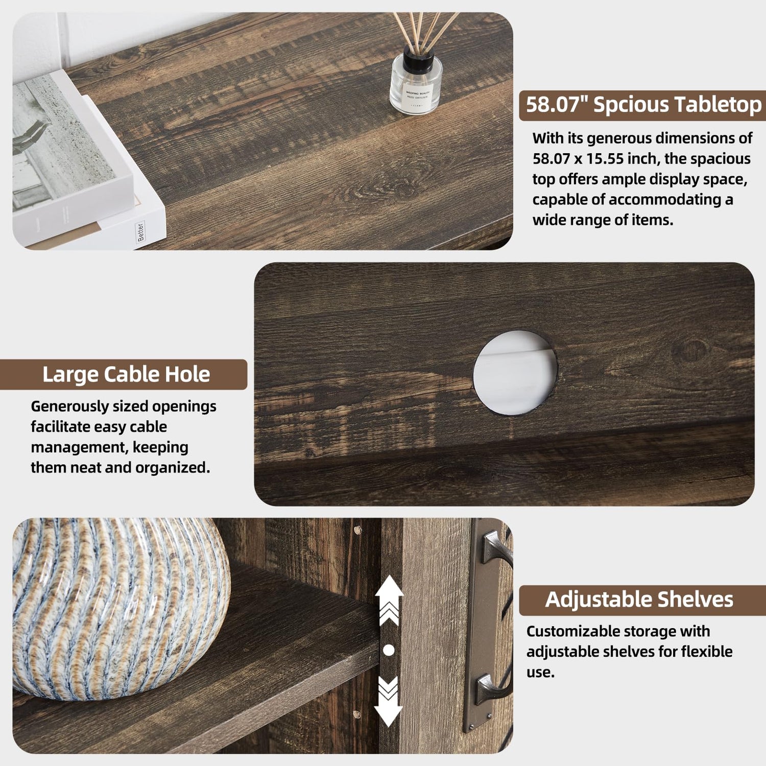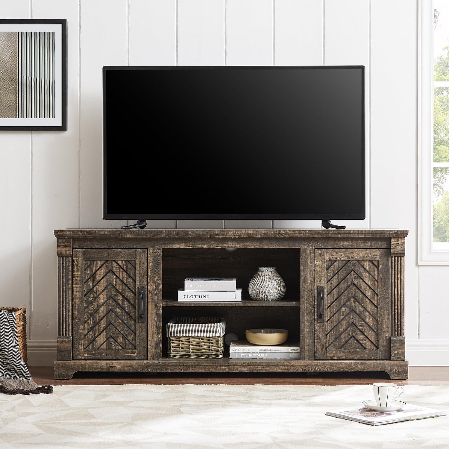 - Farmhouse Style TV Stand:Suitable for TVs up to 70 inches, with a 58" wide tabletop.Embrace rustic charm with this Minifeel TV stand designed for bedrooms, featuring a charming adorned with retro metal accents. Its one of a kind appearance, characterized by natural variations in grain patterns, hues, and textures, seamlessly blends country style into your living space, harmoniously pairing with other pieces from the Minifeel living room furniture collection.