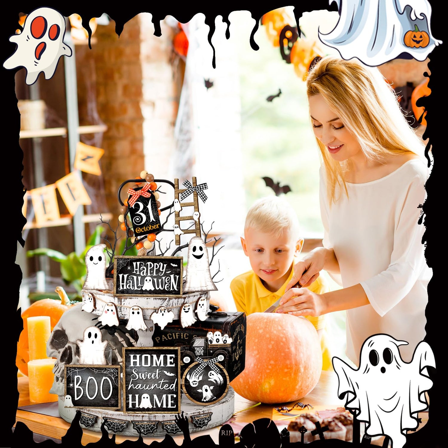 MiniInflat 21 Pcs Halloween Tiered Tray Decor Set Happy Halloween Wooden Signs Rustic Table Centerpieces Farmhouse Tiered Tray Decor for Halloween Home Table Kitchen, Tray Not Included(Ghost)