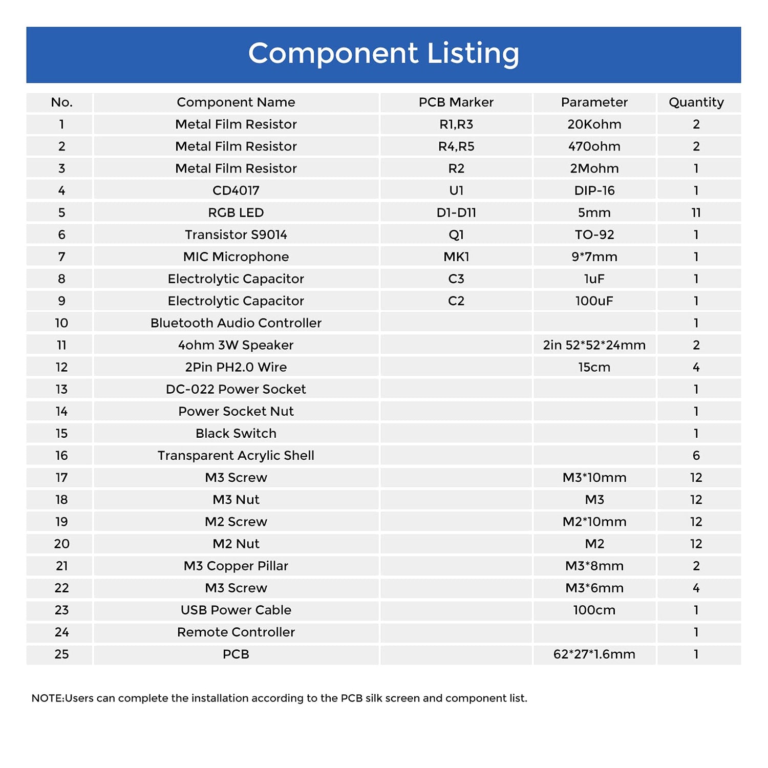 - đ”ăEasy Solderingă: The bluetooth-compatable module board is soldered and can be used directly after connection. You only need to solder the Led flashing light kit, connect the wires, and assemble the shell. About power: 5V mobile phone charger or computer power supply can be used, the sound quality will be better when the current of the power supply is 2A.