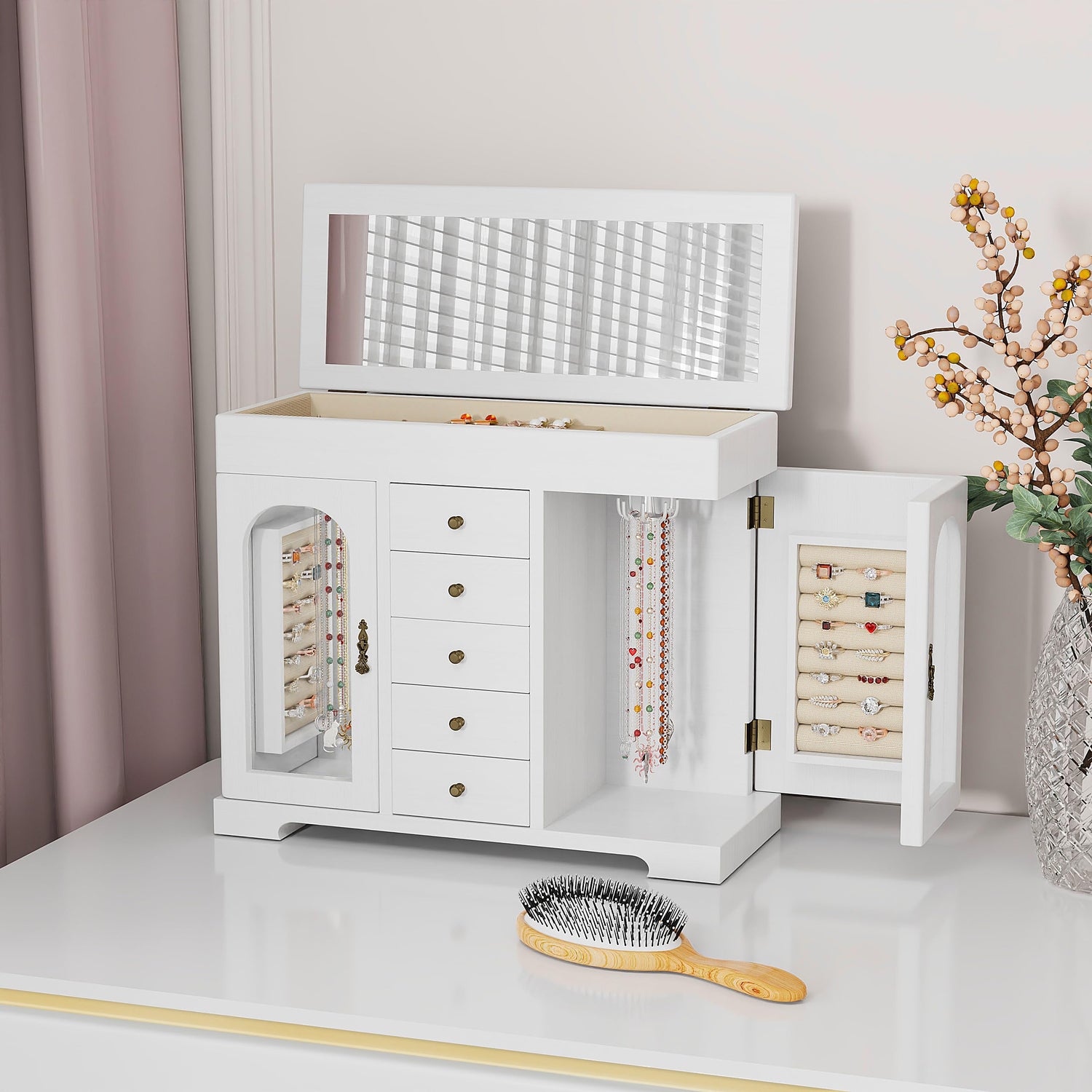 - 💝Embrace the Beauty of Your Jewelry Collection: With this exquisite and spacious jewelry box, you can keep all your treasures safe and organized. Finished in a white color with double doors, it not only adds charm to your décor but also provides ample storage for your modern jewelry collection. The 5-layer design features different compartments to accommodate various jewelry pieces such as earrings, bangles, rings, and accessories.