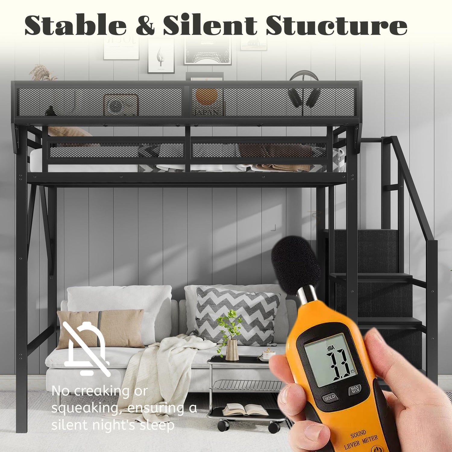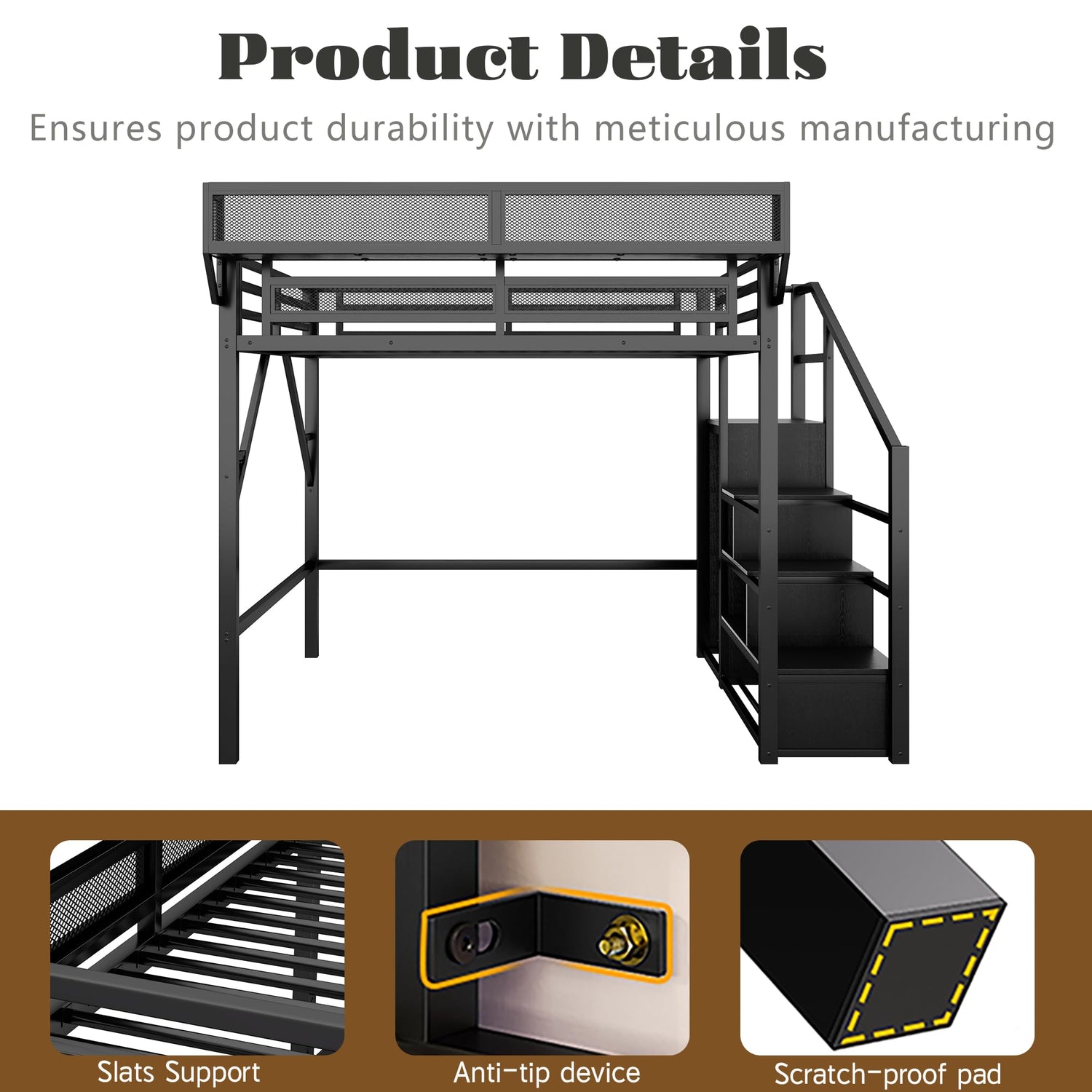 Details: Mirightone Full Size Metal Loft Bed with Staircase and Storage Shelves