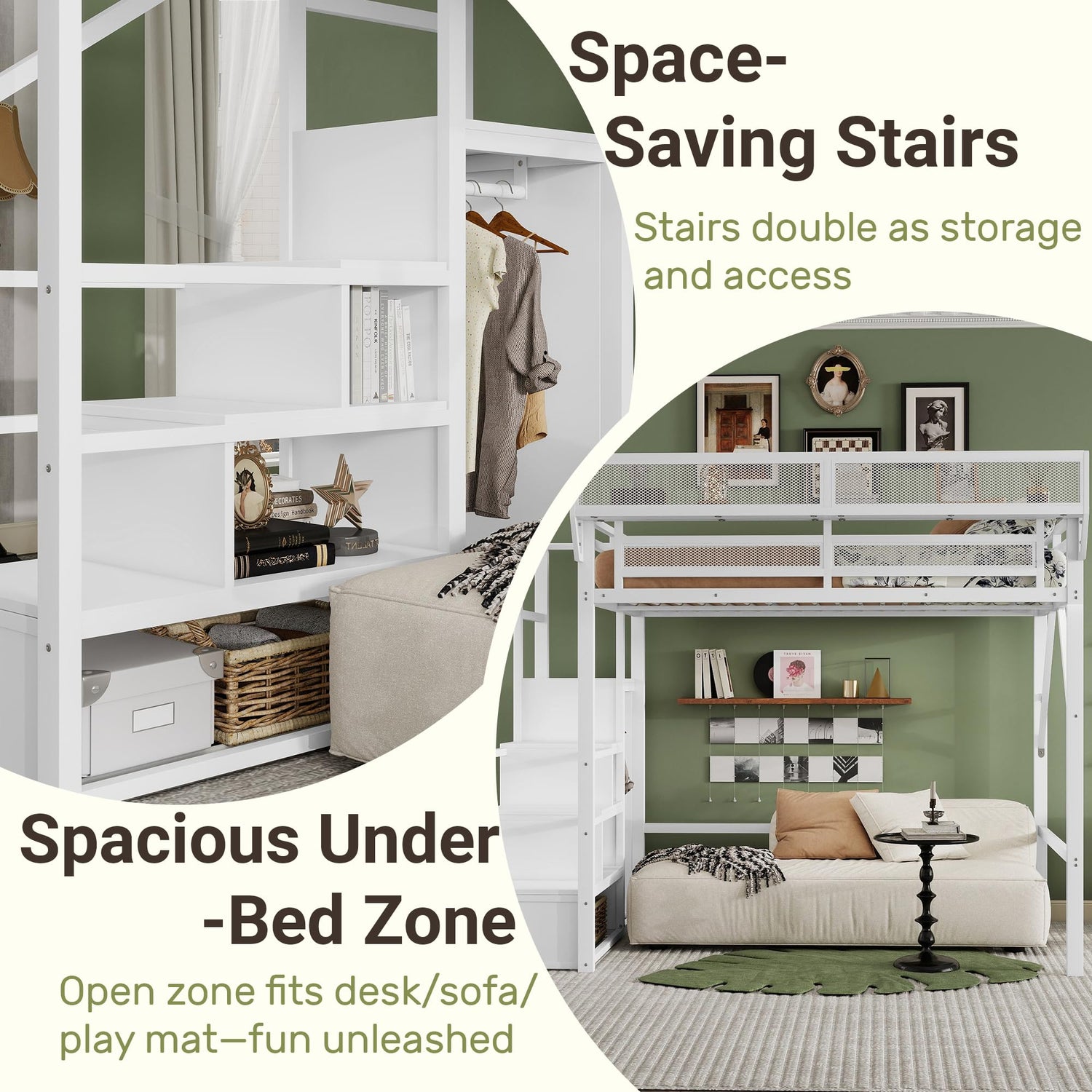 - 【Loft Bed with Storage and Stairs】:The heavy-duty loft system combines full bed and four-step stairs shelves and a compact wardrobe all in one furniture piece. Sleek and space-saving design adds a touch of elegance to any bedroom. Ideal for any living environments, like children’s bedrooms, universities, residential treatment facilities, and bunkhouses.