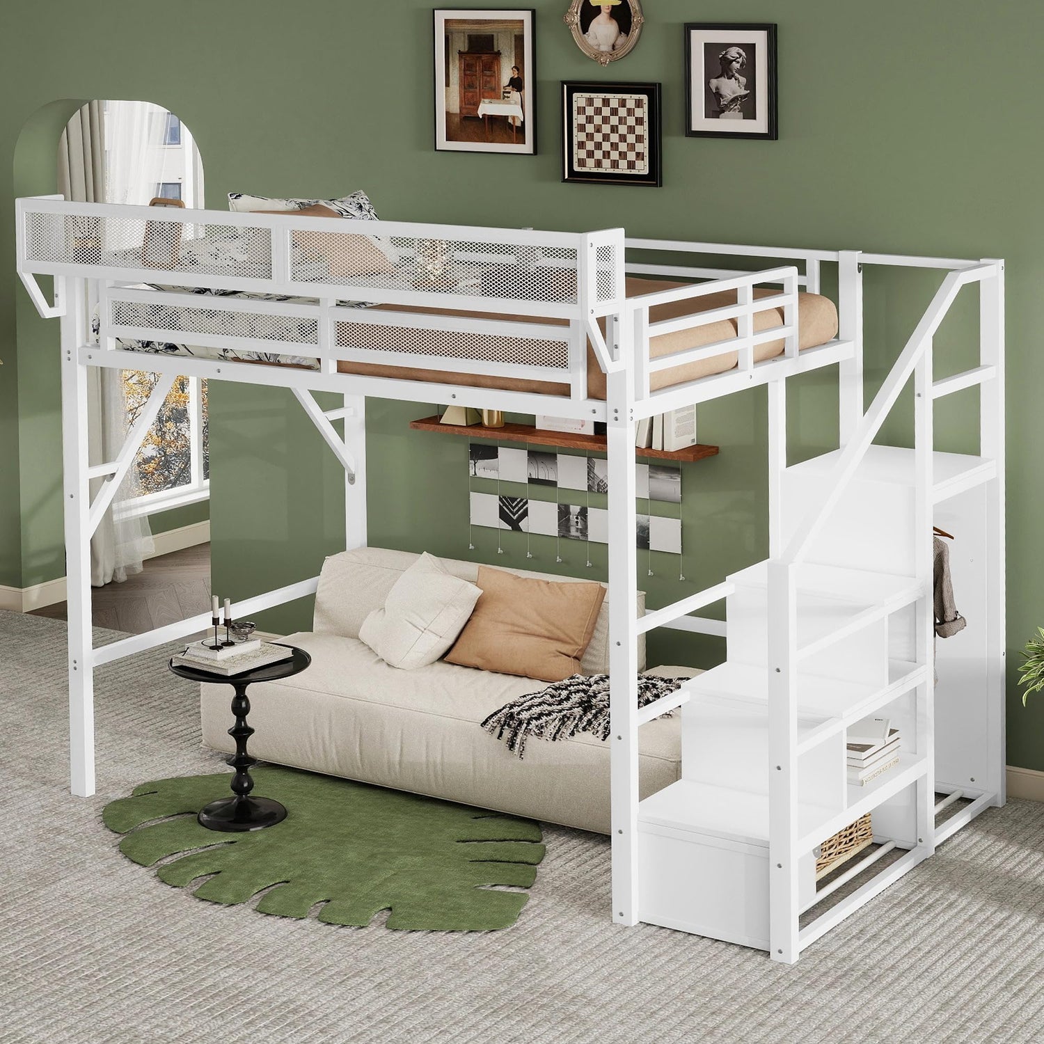 Mirightone Full Size Loft Bed with Stairs and Storage, Metal Loft Bed Frame with Bedside Shelf and Large Under-Bed Space, Heavy-Duty Loft Beds for Adults Teens and Kids, White