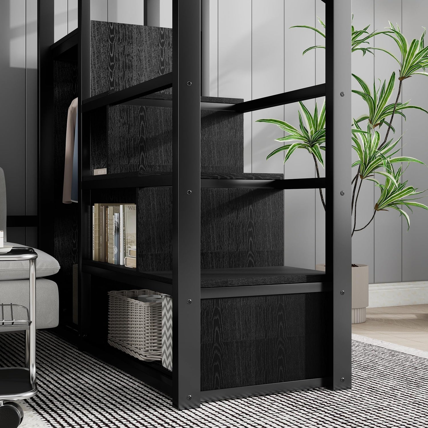 Mirightone Full Size Loft Bed with Stairs, Metal Loft Beds, High Loft Bed Frame with Storage Shelves, Lofted Full Bed with Wardrobe for Kids and Teens, No Box Spring Needed (Black)