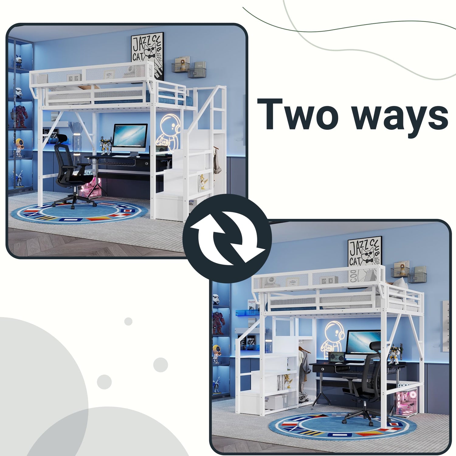 - 【Metal Full Loft Bed with Staircase】: The metal full-size loft bed is equipped with stairs and built-in storage compartments, making it easy to store items such as shoes, toys, or blankets. These steps ensure safe and convenient access to the bed, enhancing practicality and safety.