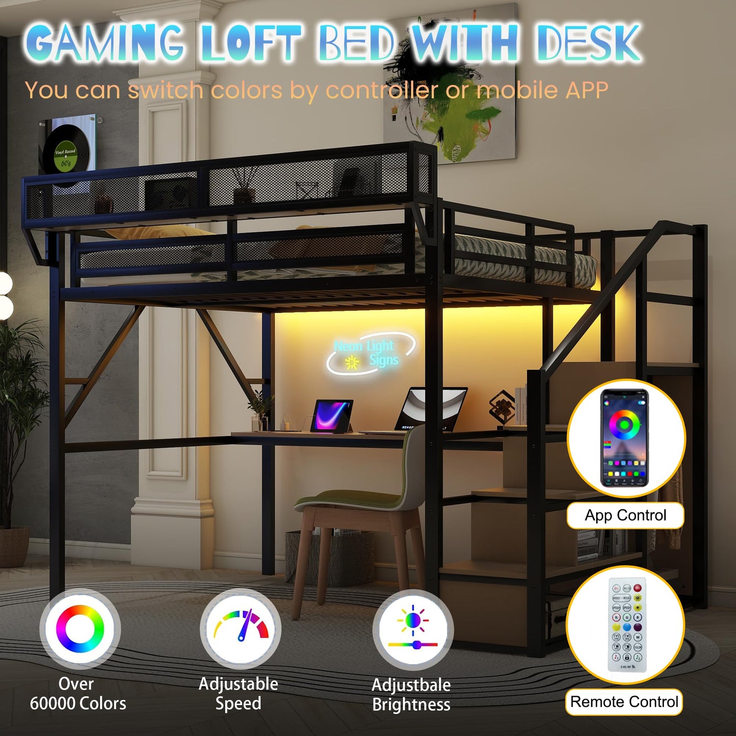 Mirightone Gaming Queen Loft Bed with Desk and Stairs, Metal Lofts Bed Queen Size with Upper Storage Shelf, High LoftBed with Light, USB Charging Station and Wardrobe for Adults, Teens, Black