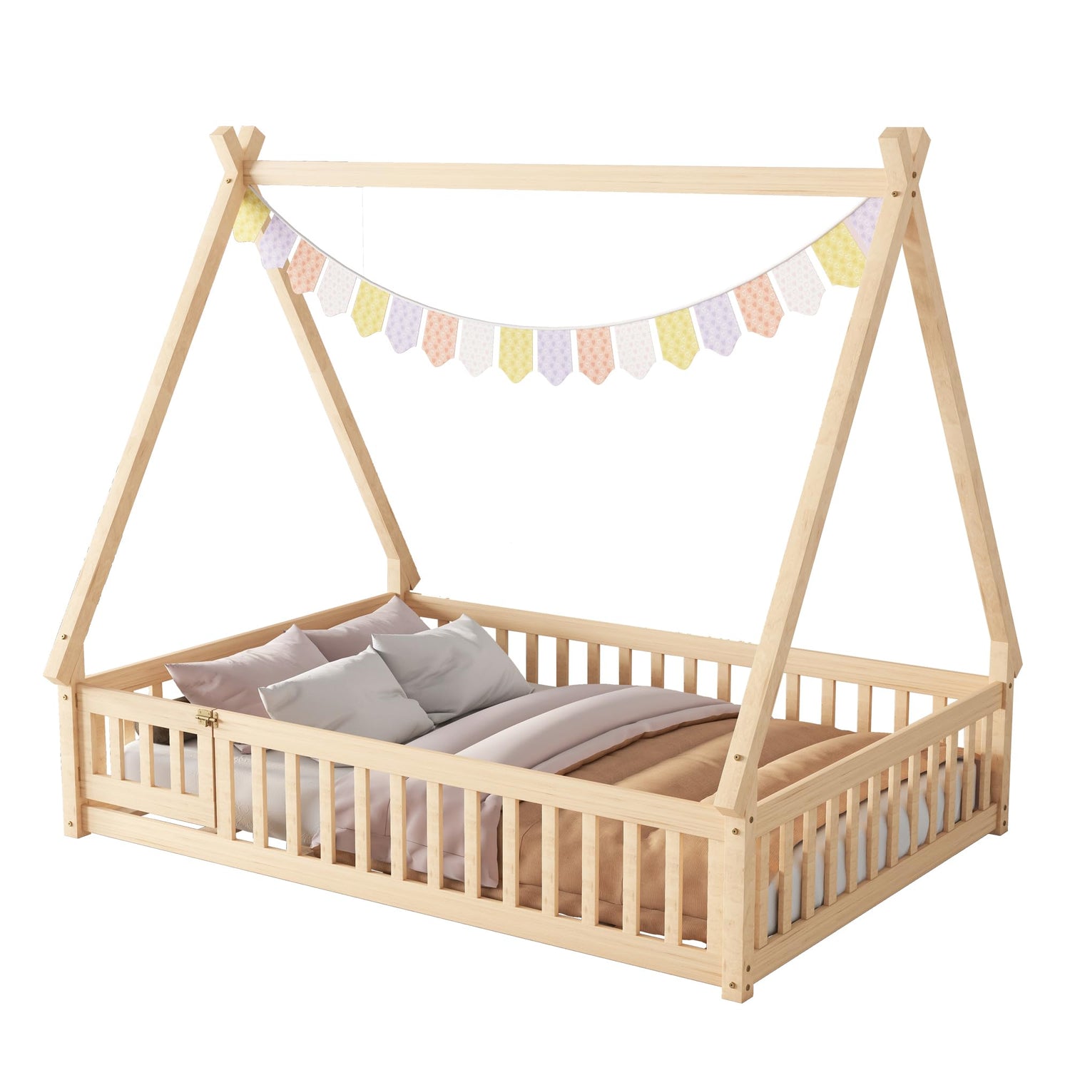 Introducing the Mirightone Full Size Montessori Tent Floor Bed with Slats and Guardrails in Natural Wood – a beautifully crafted sleeping solution designed to inspire creativity and comfort in your child's bedroom.