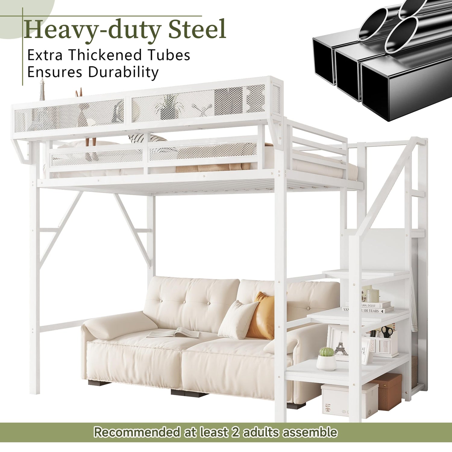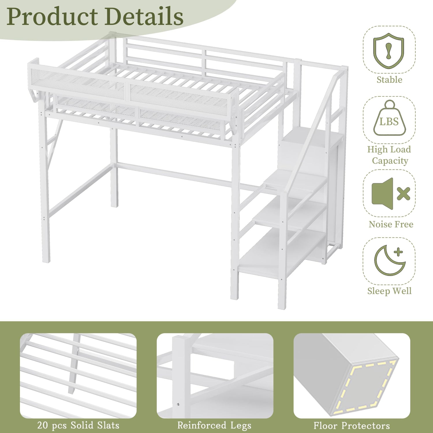 Mirightone Twin Size Loft Bed with Stairs and Storage, Metal Loft Bed Frame with A Shelf and Large Under-Bed Space, Heavy-Duty Loft Beds for Kids Boys Girls Teens, White