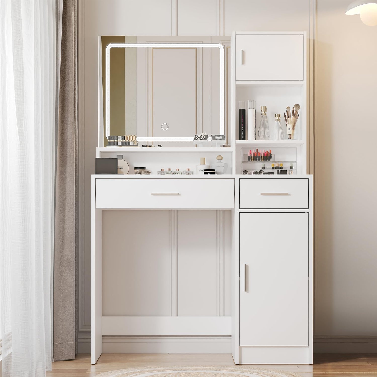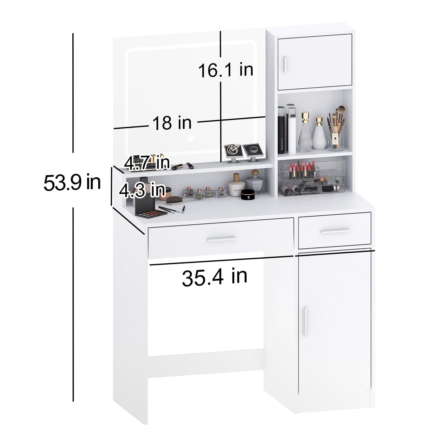 - ใ ๐๐ง๐ญ๐๐ฅ๐ฅ๐ข๐ ๐๐ง๐ญ ๐ฌ๐ญ๐จ๐ซ๐๐ ๐ ๐๐๐ฌ๐ข๐ ๐ง ใ:The vanity desk size is 15.8โD x 35.5โW x 54โH, with reasonable storage space. Specially designed partitions with cabinet doors can place items and prevent them from falling. The clear design allows you to quickly find the items you need, improving the efficiency of the makeup process.
