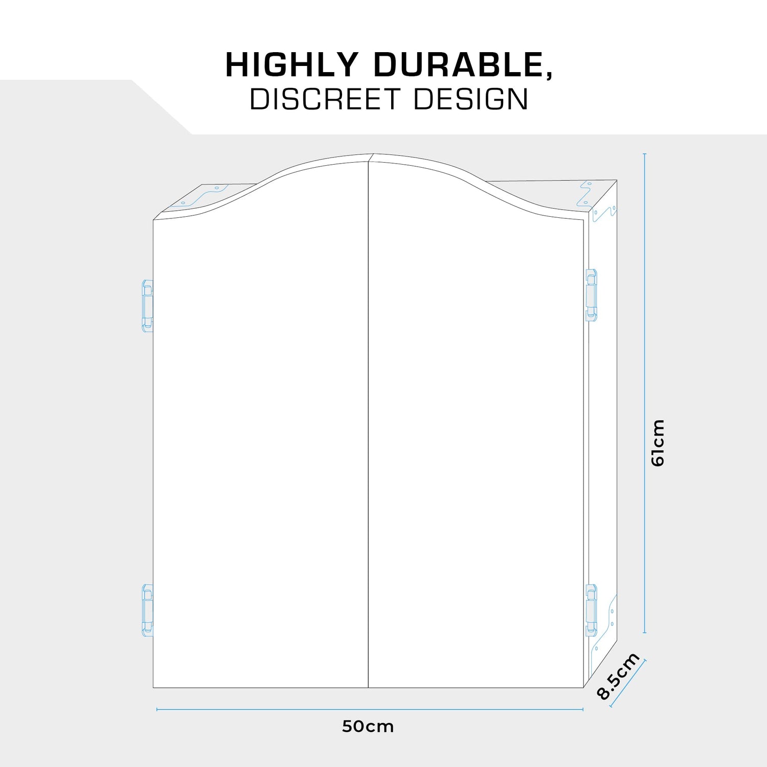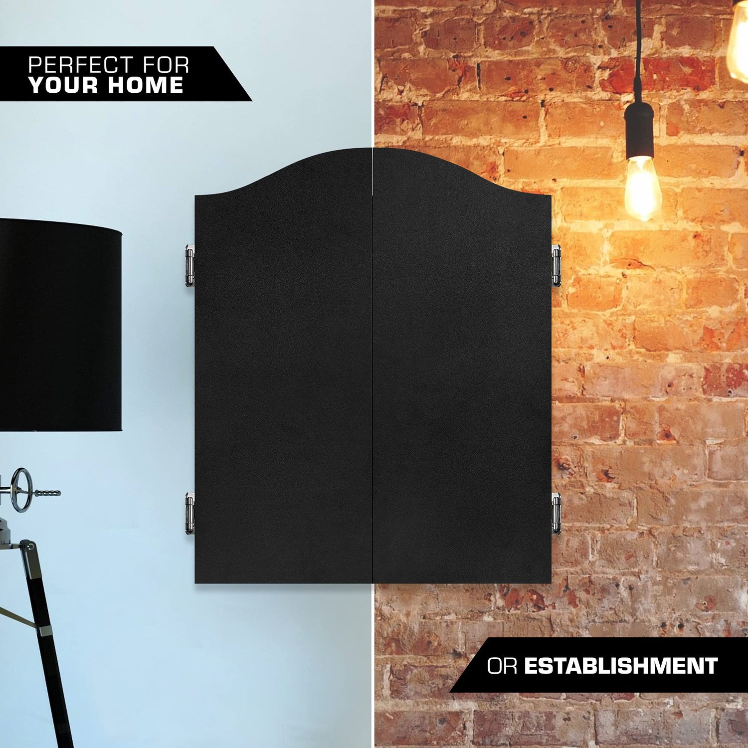- The Mission Dartboard Cabinet is highly durable, featuring premium hinges and reinforced corners for extra strength and stability.