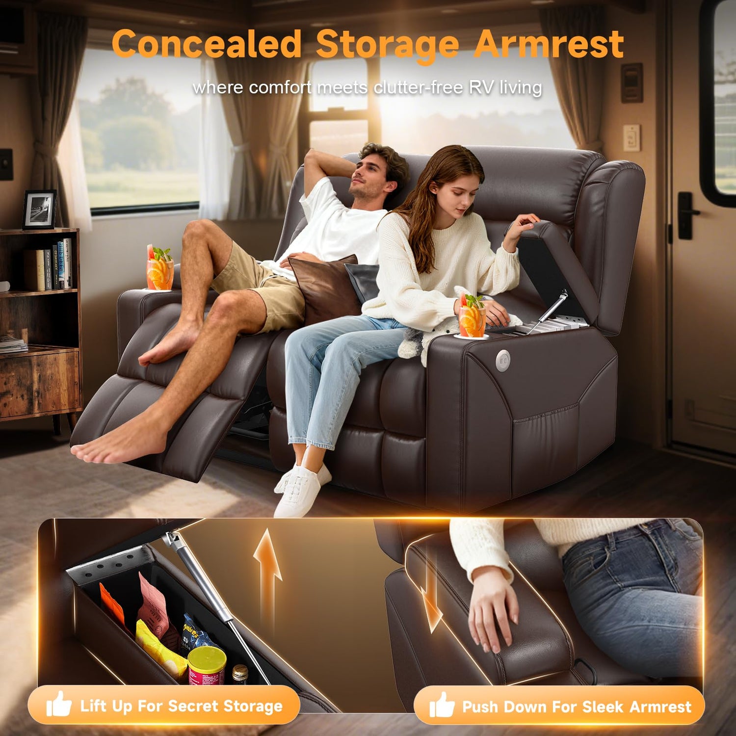 - Versatile Design - Both sides are equipped with USB ports, cup holders and storage pockets. Easily charge your phone and get drinks on the RV recliner couch. Beneath the elegant armrest lies ample storage space, together with the side pockets, significantly enhancing space utilization—keeping your cozy and romantic RV neat and organized at all times