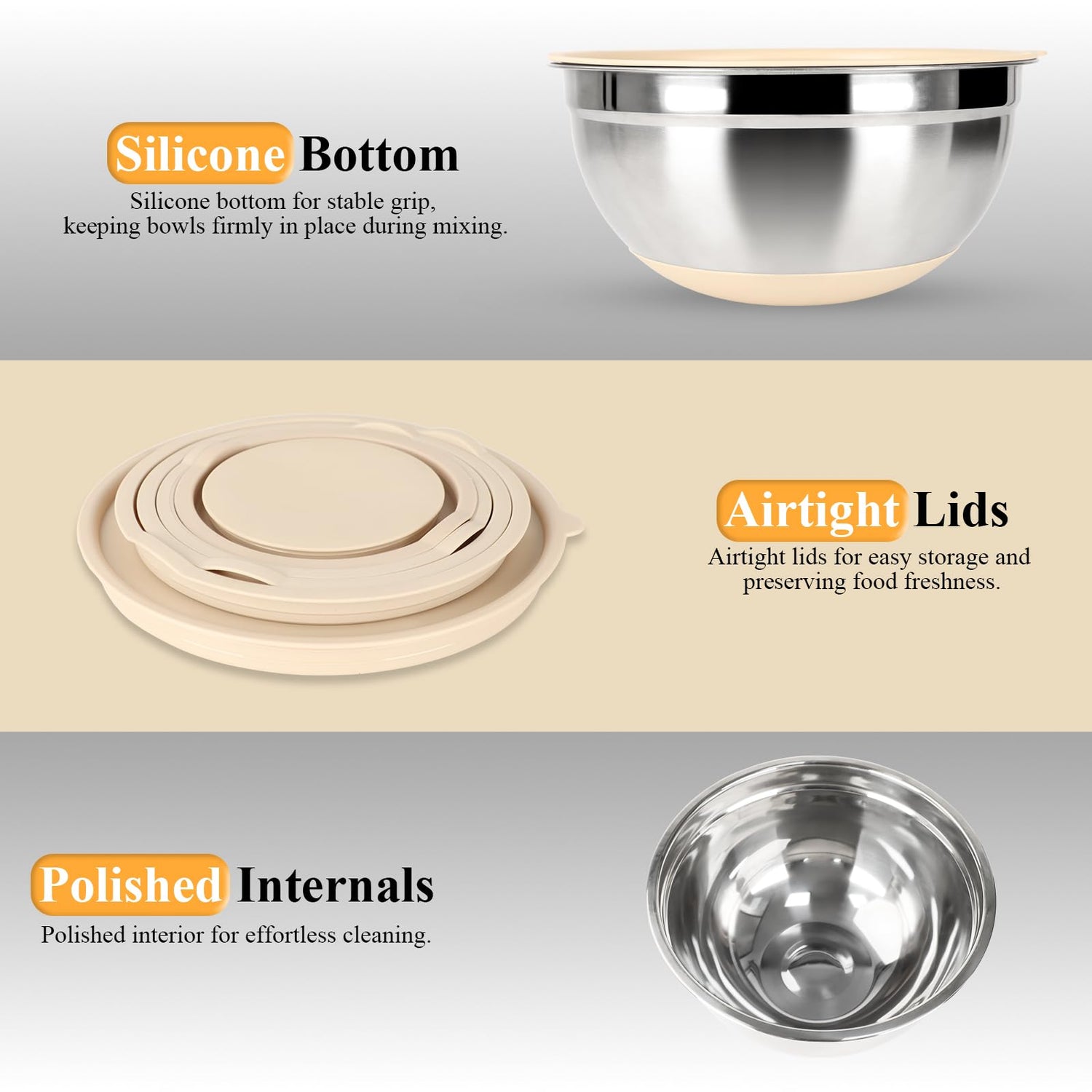 - 【Non-Slip Silicone Bottom】 Each bowl is equipped with a silicone bottom that provides a secure grip and keeps it firmly in place to prevent sliding on countertops. It also reduces noise, acts as a thermal barrier to protect your countertop from heat generated during mixing or cooking, and minimizes potential damage to kitchen surfaces. The overall stability and control it provides contribute to a more enjoyable and efficient kitchen experience