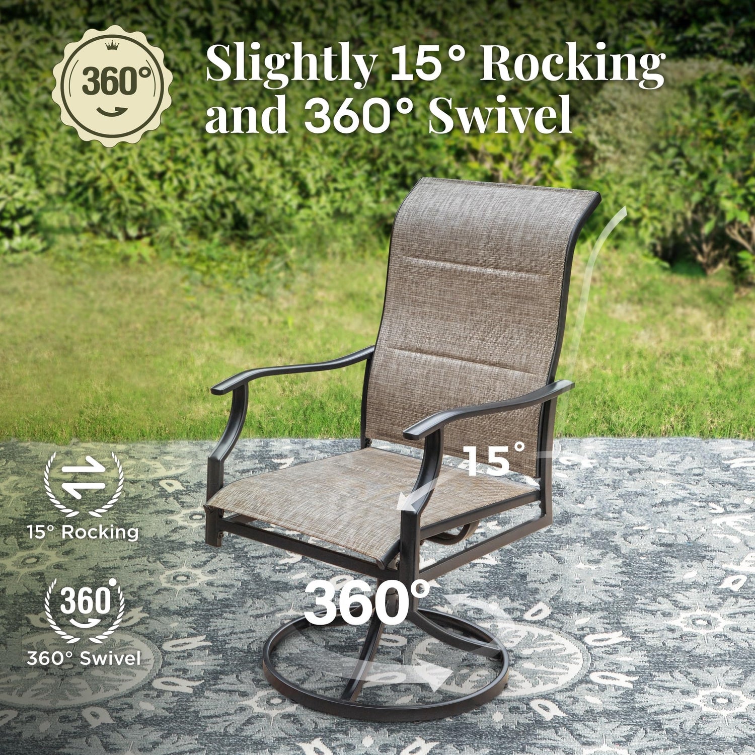 - 5 Pieces Patio Dining Set: The outdoor dining set consists of 4 x textilene chairs and 1 x 42" round table (1.57" umbrella holes). The chair can rotate 360 degrees while swining back and forth 15 degrees. Superior quality and comfort make any backyard, balcony, terrace an elegant dining place, creating an outdoor comfort zone for you