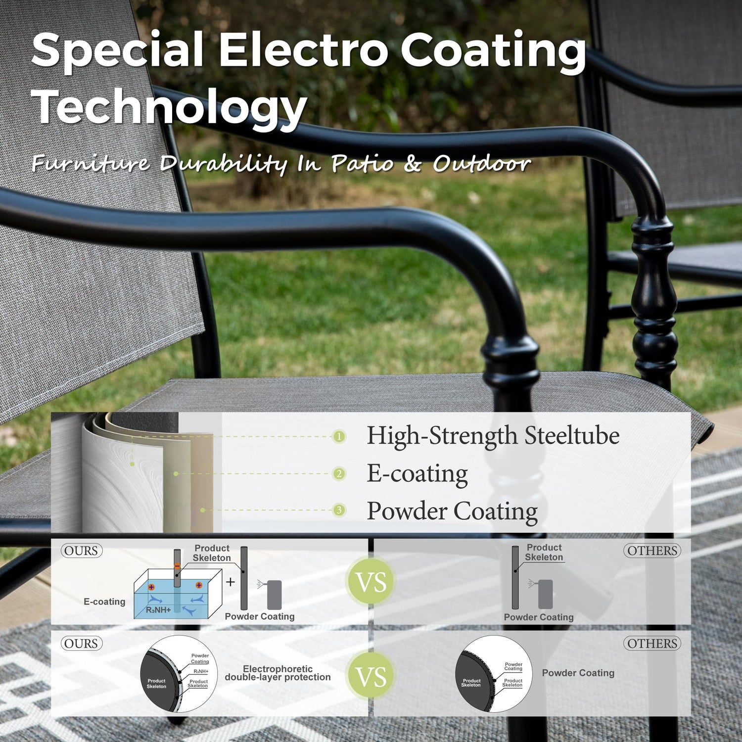 - E-Coating & Powder-Coating TECHNIQUE: This backyard furniture set is made of E-COATING and POWDER-COATING dual techniques that are all weather resistant and easy to clean, with no special care needed. The single chair could support up to 350 lbs weight