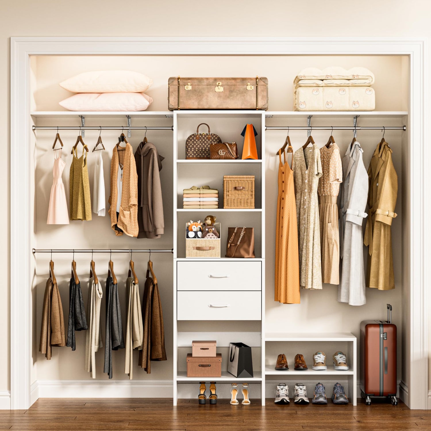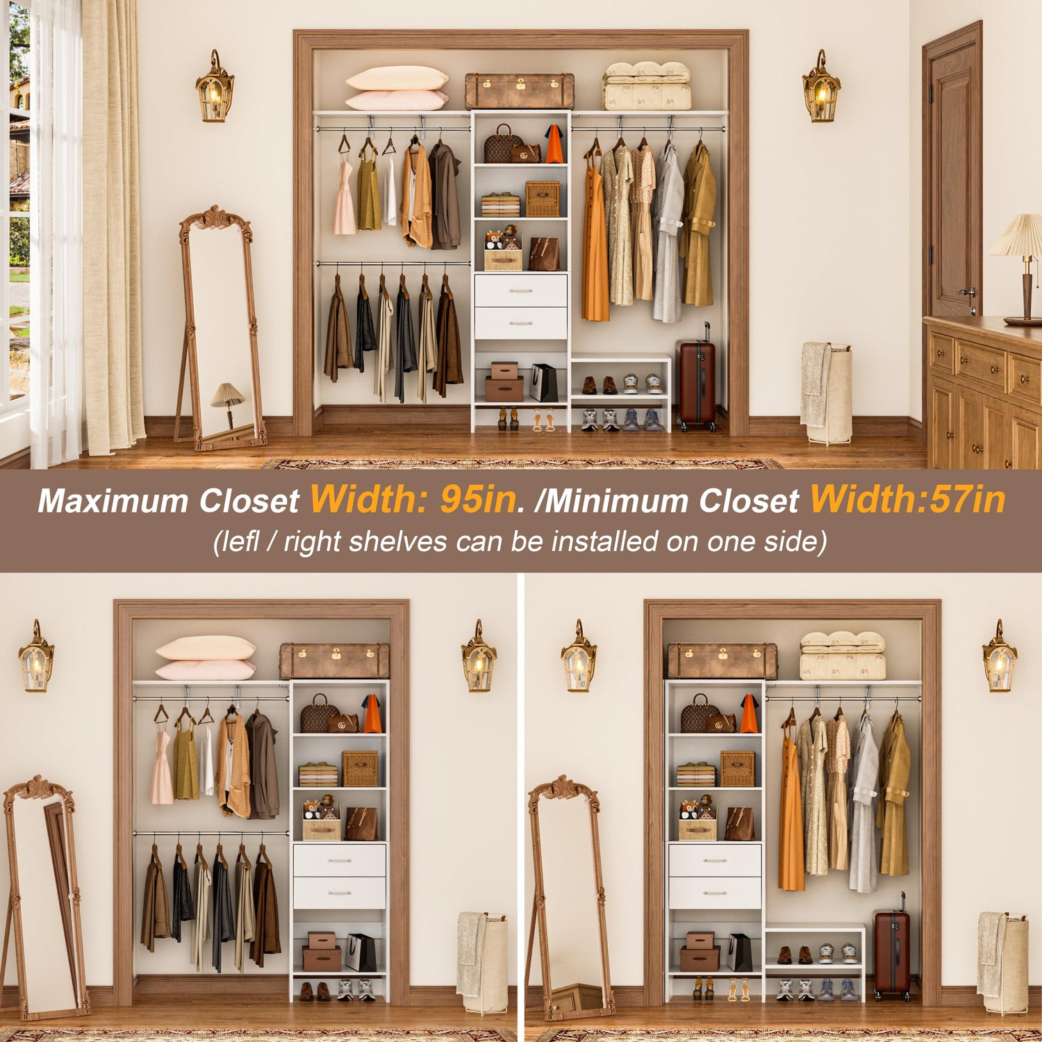 - 【Easy Installation】Install your new closet system effortlessly with MJOMKN. Everything you need comes in one package, including tools and clear instructions. Each part is labeled for simple assembly, and reinforced packaging ensures safe delivery.