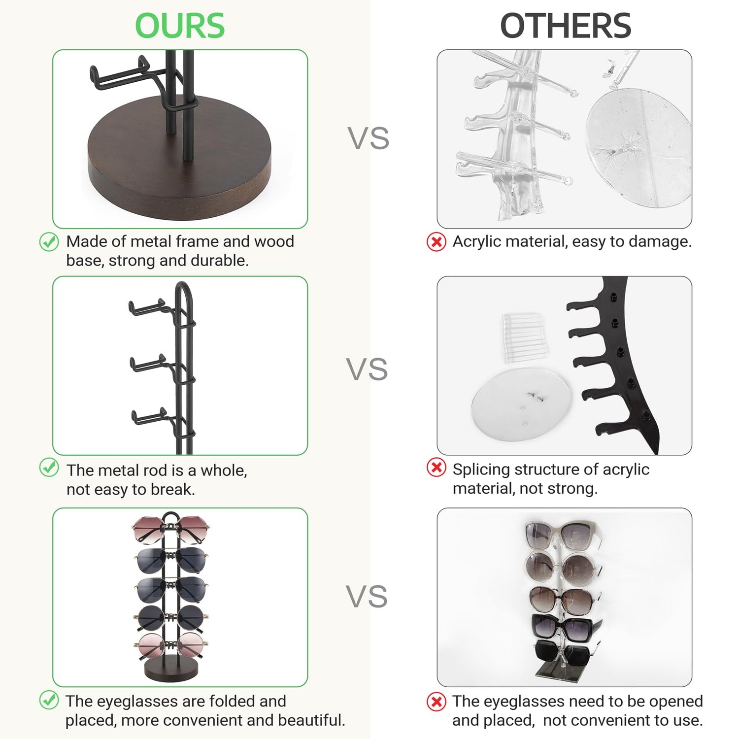 - Safety & Practicability : Comes with a wooden round weighted base which makes it stand firmly and stably on the table. Also the metal material with a smooth finish, will not rust and scratch your glasses. The sunglasses organizer can be used for a long time.