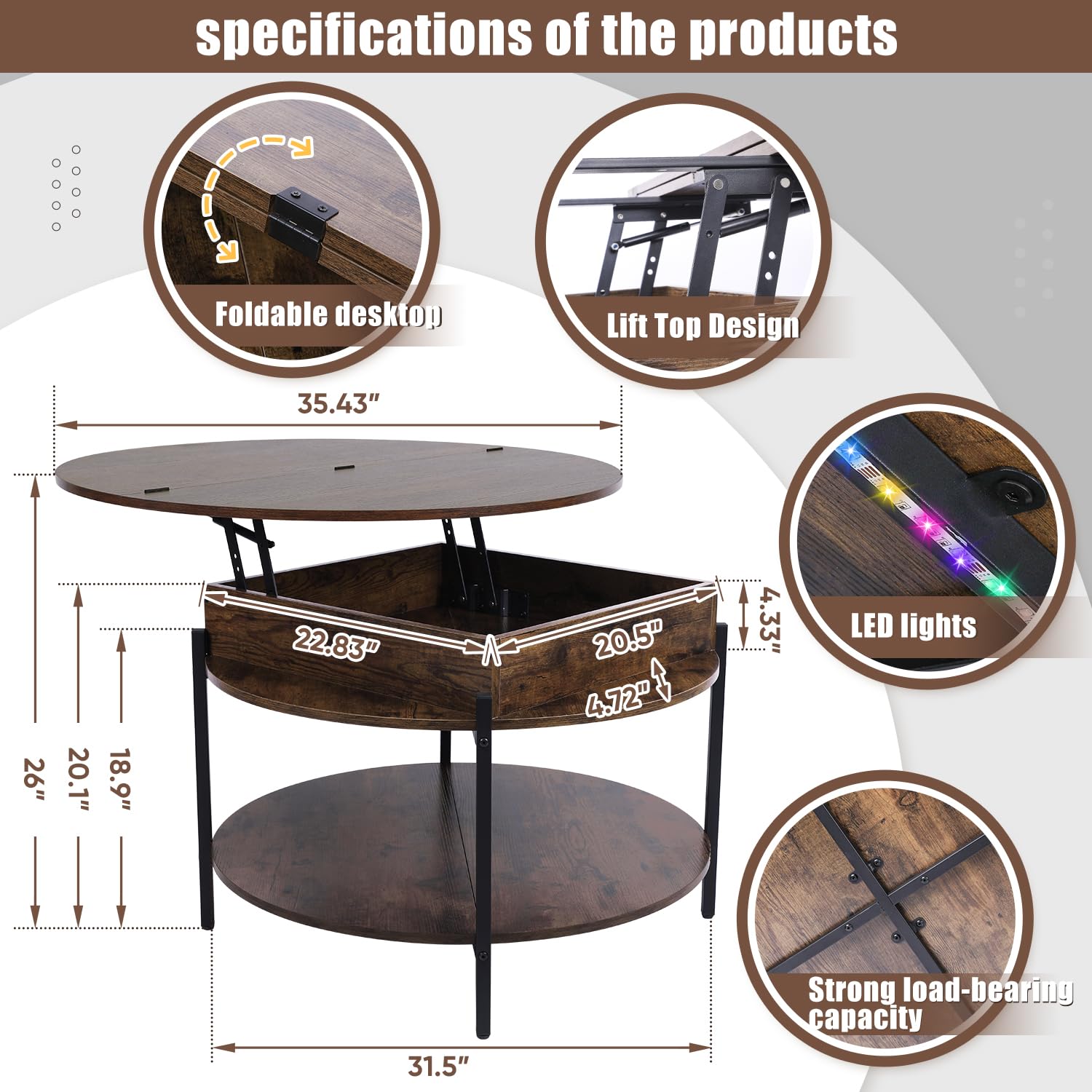 Mmucco 35.43" Round Lift Top Coffee Table with 2-Tier Storage, Circle Storage Coffee Tables with LED Light for Living Room,Round Storage Coffee Table for Home Office