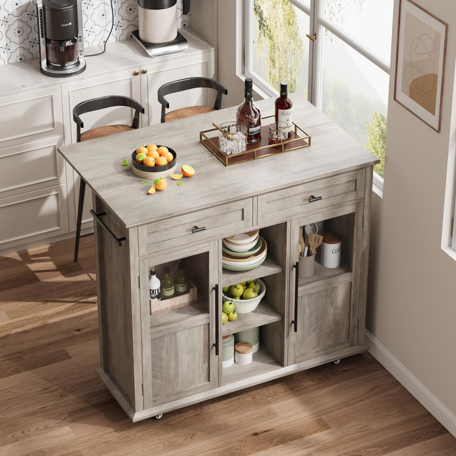 Mobile Modern Storage Island,Rolling Kitchen Island with Drop Leaf - Door Cabinet, Drawer, Bar Cart with Cabinet, Portable Cart Island Table for Kitchen,Grey