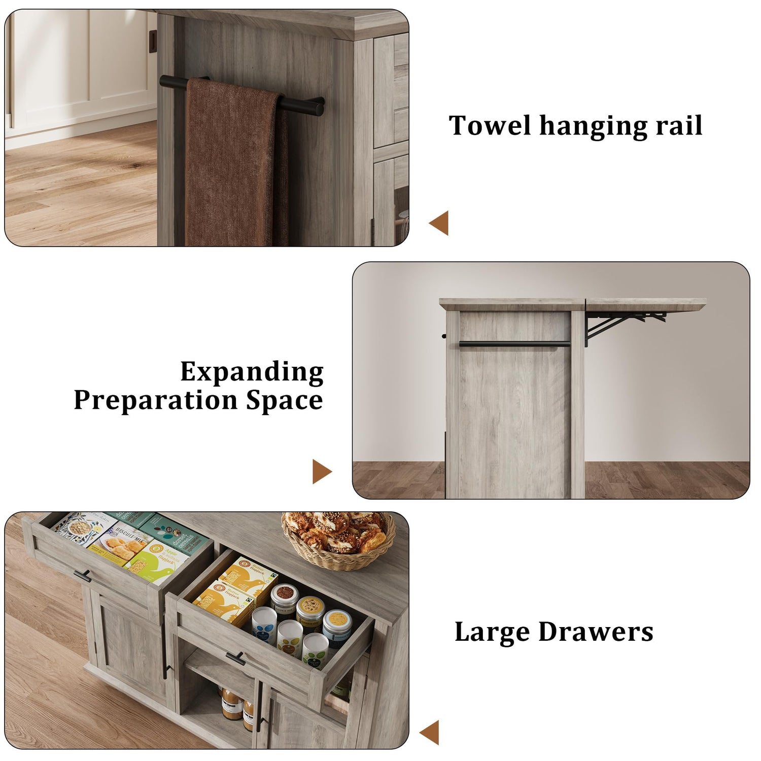 - Smart Storage Islands – This 41"x16" rustic island combines 2 cabinets, 2 drawers, and 3 shelves with a fold-out extension board (adds 12" workspace) and towel bar—crafted from solid wood for durable, timeless charm.